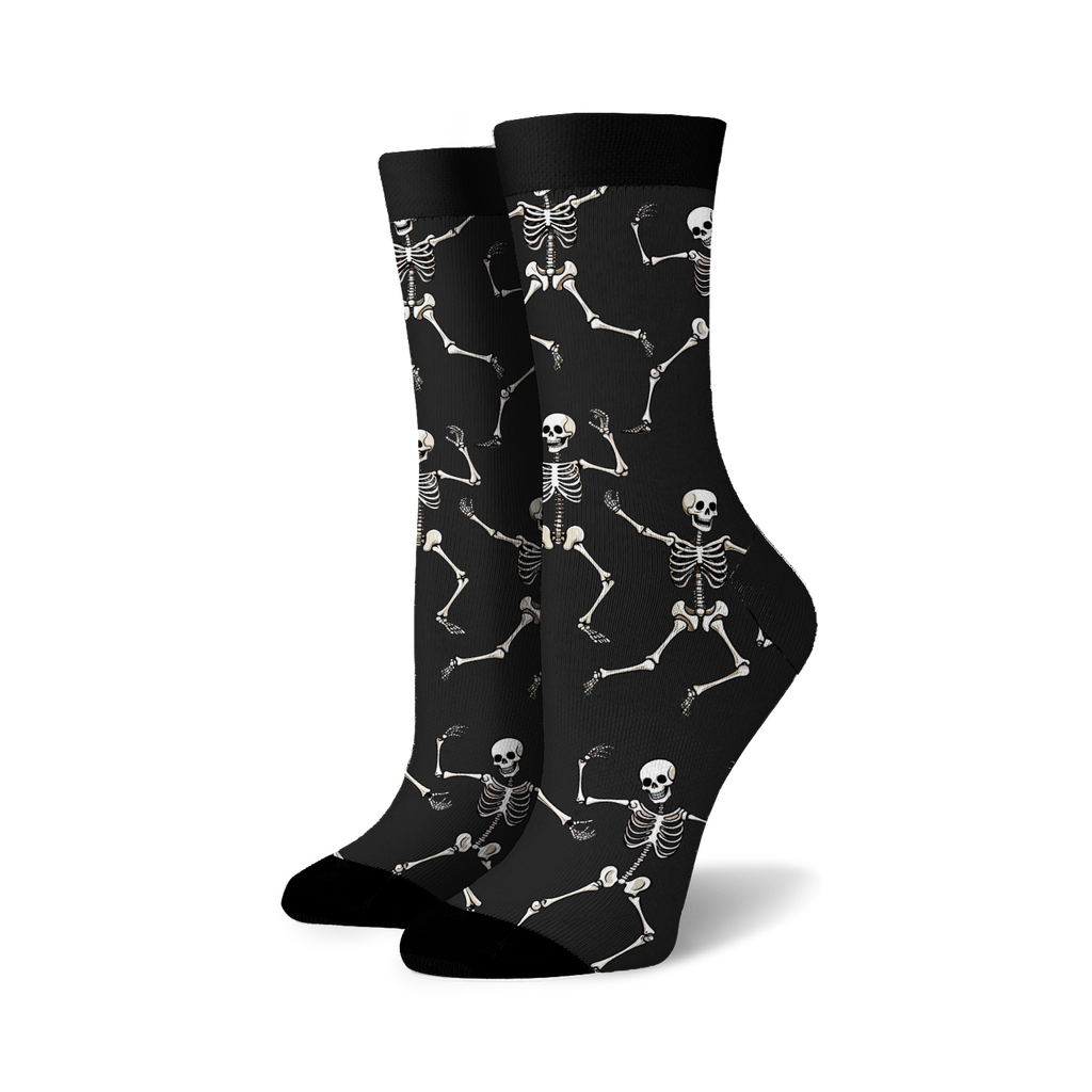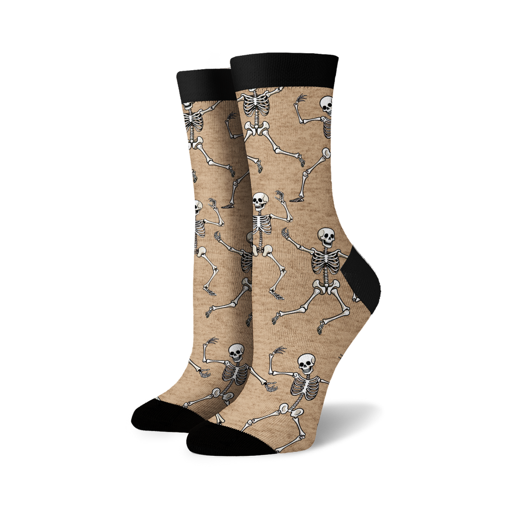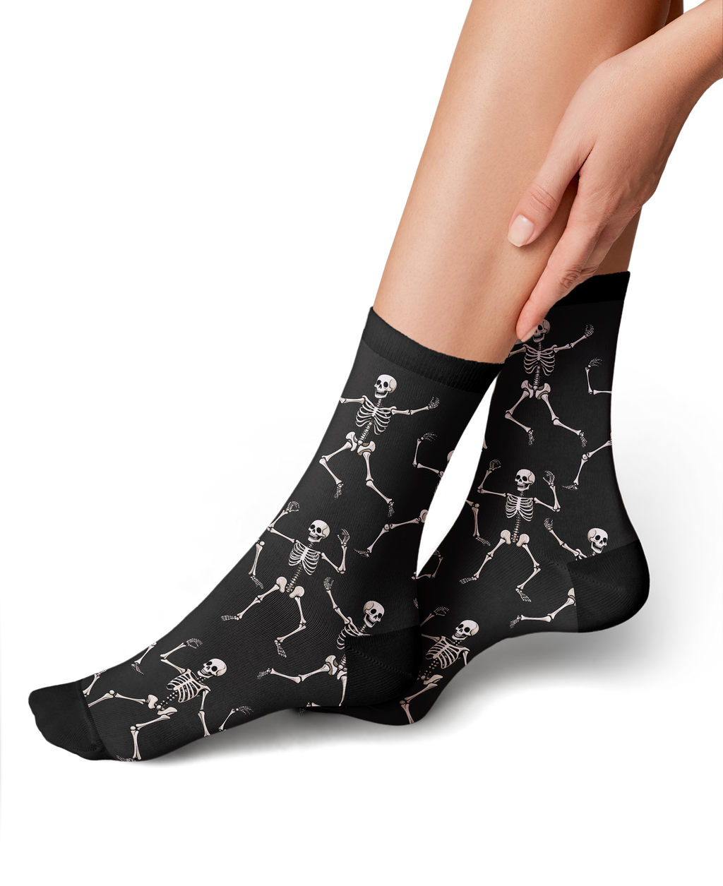 Get ready to boogie with the 'Dead Man's Party' socks! These crew socks feature a fun pattern of dancing skeletons- some are shown doing the twist, others are striking a pose. The visible parts of the socks come in two colorways: a tan-ish beige and a classic black. The skeletons are a crisp white-ish color against the background. They're comfy, cottony socks that are perfect for adding some spooky style to your everyday life. Think of them as your new favorite party accessory- minus the messy cleanup.