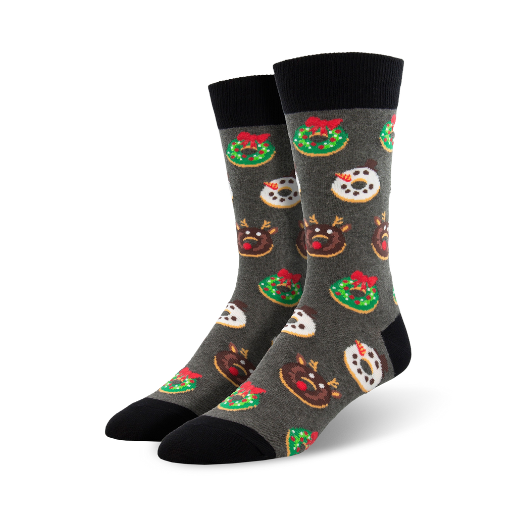 Get ready to jingle your bells and tantalize your toes with these Decorative Donuts crew socks! Picture this: a gray canvas adorned with cartoon doughnuts covered in red, white, and green sprinkles, playfully frolicking alongside reindeer sporting jolly Santa hats and shiny red noses. With these socks on, you'll be the life of the Christmas party, spreading cheer and laughter wherever you go. So slip into these cozy, festive socks, grab a cup of cocoa, and let the holiday spirit fill your heart!