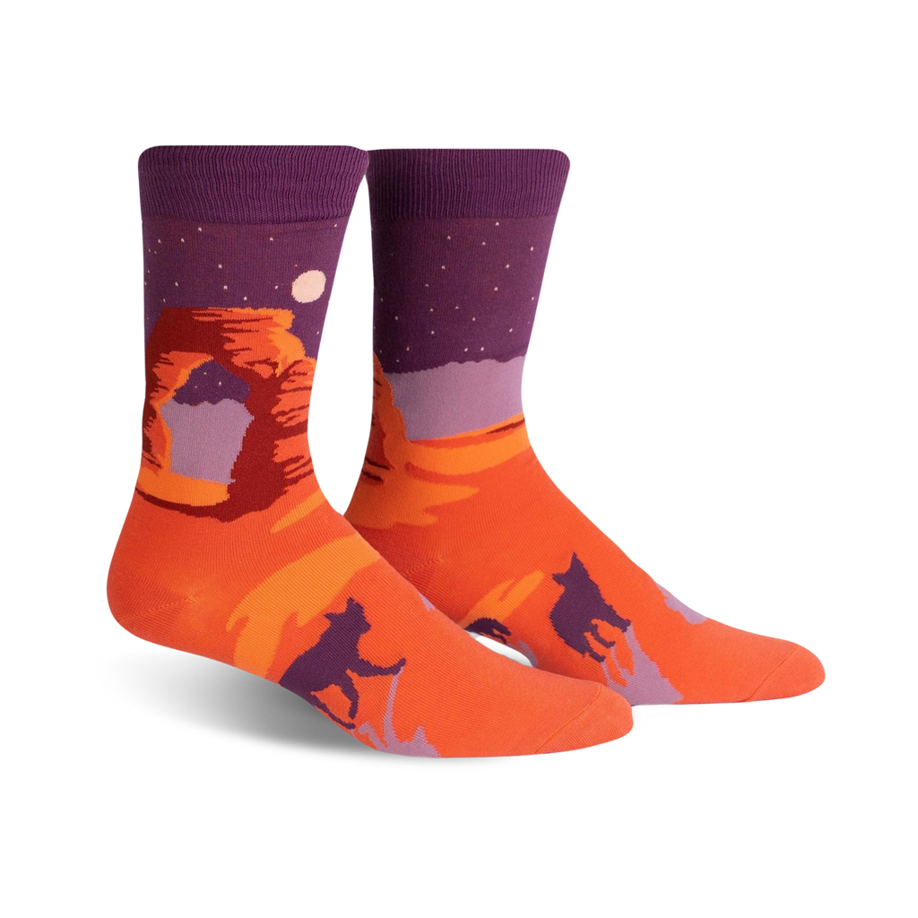Get ready to trek through the desert in these Delicate Arch crew socks! Featuring a stunning design of a red rock formation under a moonlit sky, these socks are perfect for any outdoor enthusiast. Made for men, they're as rugged as the terrain they're inspired by. Whether you're hiking, camping, or just relaxing at home, these socks will keep your feet cozy and stylish.