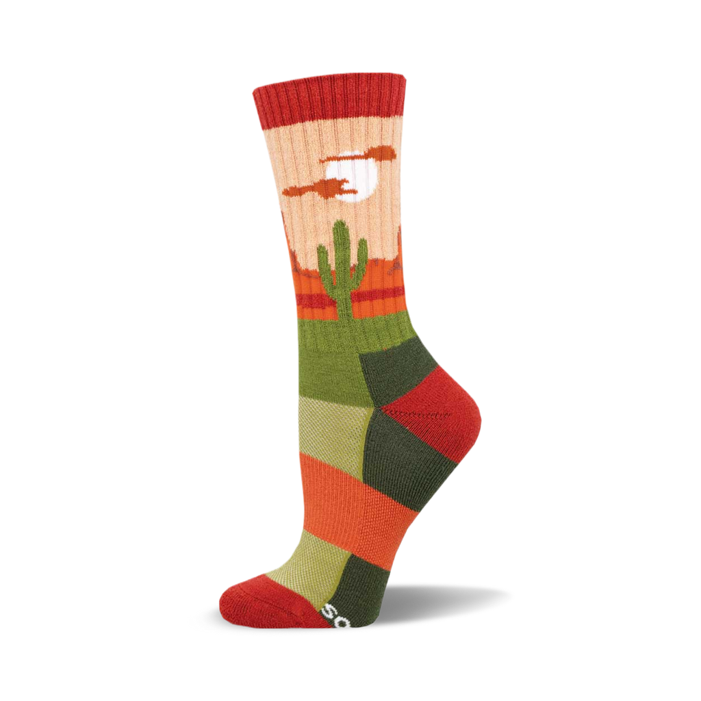 Looking to prick some fun into your wardrobe? Our "Desert Plains" novelty socks are just the thing! Adorned with a cheeky cactus pattern set against a vivid desert backdrop of red, orange, yellow, green, and blue mountains, they are a burst of fun for your feet. Perfect for adding a pop of color to your day or cheering up your office attire. Heading to a barbecue or a casual day out? Don't leave your personality hanging - let it stride boldly alongside you in these vibrant crew-length socks. Why be mundane when you can be striking?