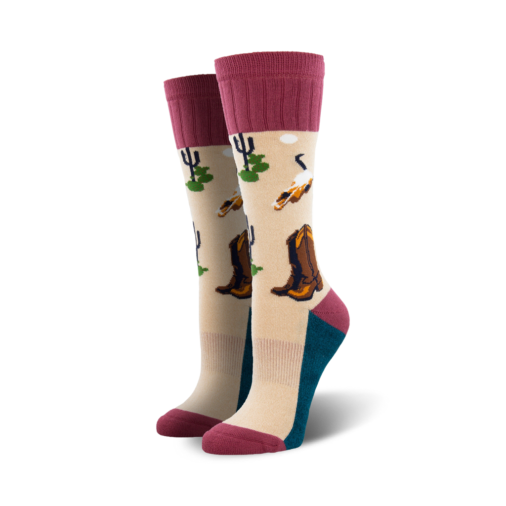 Step into the wild, wild West with these rodeo-ready, beige-colored boot socks with pink accents featuring a bold pattern of cowboy boots, cacti, and skulls - a great addition to any sock drawer. Cowgirl up and strut your desert-inspired style everywhere you go.