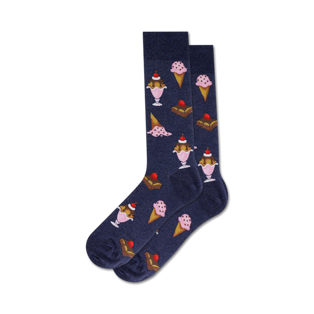 Treat your feet to a sweet escape with our DESSERTS crew socks! These blue socks are covered in a delicious assortment of ice cream cones, sundaes, and brownies that are sure to satisfy your cravings. Whether you're a chocoholic, a sundae enthusiast, or just love a good scoop of ice cream, these socks will make you smile every time you wear them. Bonus: Wearing these socks might just fend off those afternoon sweet cravings!
