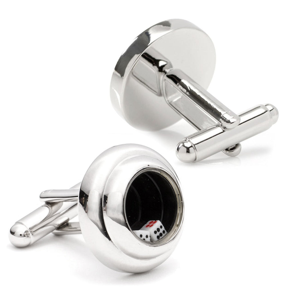 Real miniature dice are enclosed behind the glass casing to provide you with a gaming platform anywhere. Shake the cufflinks and the dice actually roll. Rhodium plated setting. Cufflinks by Cufflinks, Inc.
