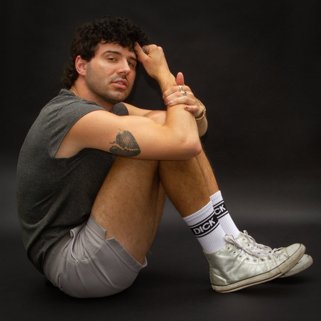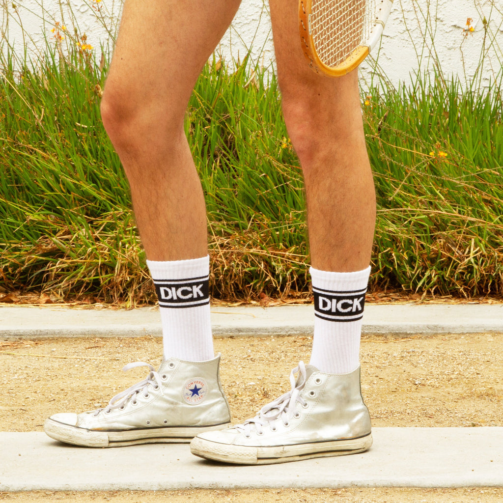These 'Dick' socks are pretty straightforward. They're white crew socks with a black band around the top that says, well, 'DICK'. The visible portion of the sock also has a black heel and toe. Simple, bold, and ready to make a statement. They're shown paired with silver high-tops in the images, but hey, they'll look good with whatever you're wearing.