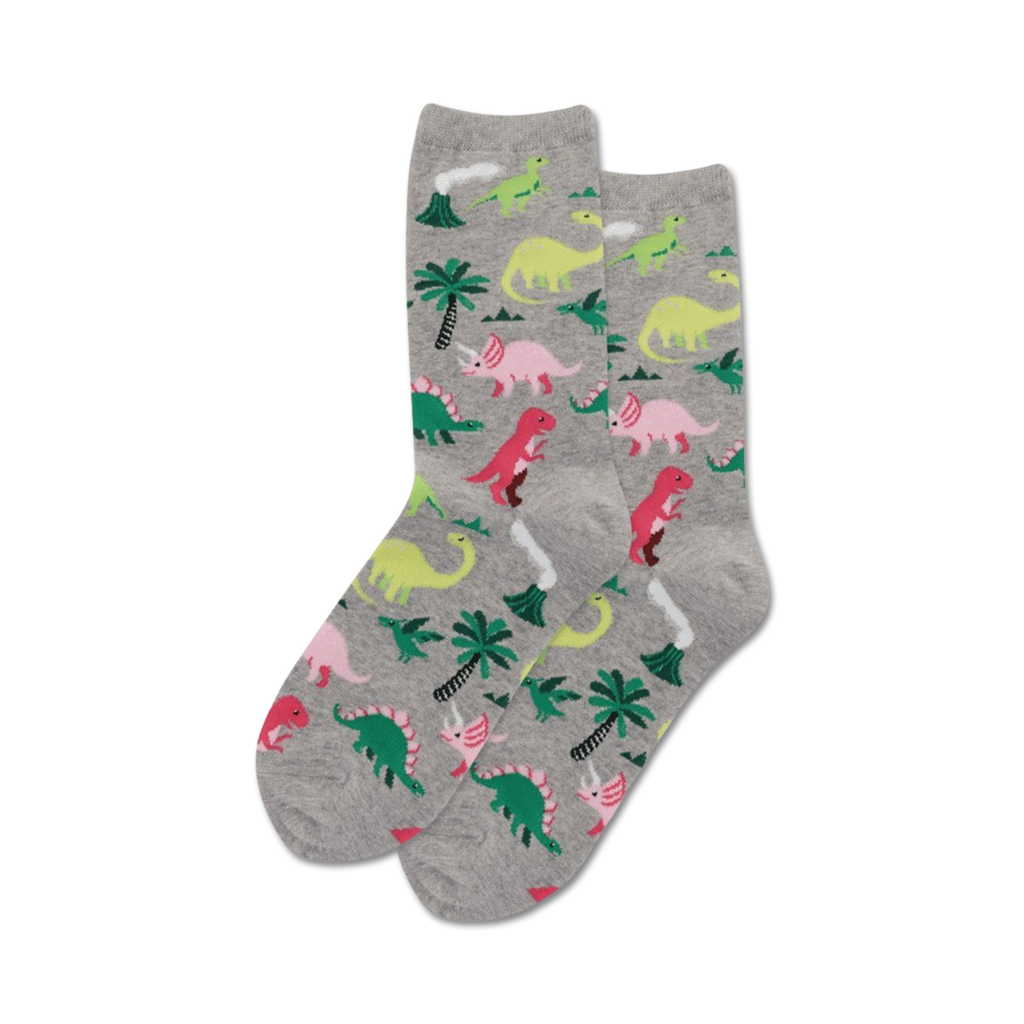 Dinosaurs stomp into the sock scene in this crew length collection designed for women. Show off your love for the prehistoric with a pair of these black crew socks featuring a colorful pattern of triceratops, T-rexes, and palm trees. Fun fact: A T-rex's bite was stronger than the bite of any other land animal!