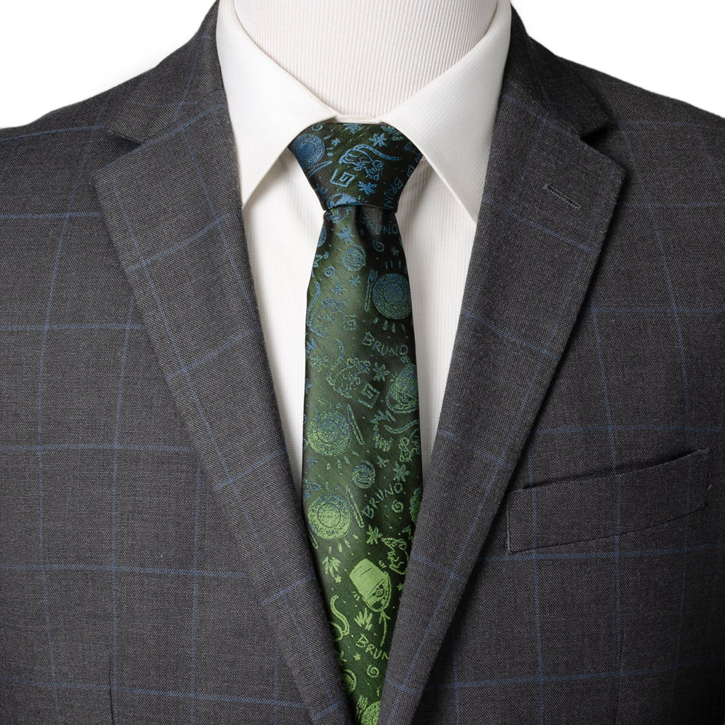 Stylish, fun, and professional with a little Disney magic, this Bruno tie is perfect for lovers of Encanto. The black base of this silk blend tie accentuates the iridescent icons from the movie, including Bruno's face, his dinner plate, his name, and even his rat companions. On the reverse of the tip reads, "We Don't Talk About Bruno." Experience enchantment with our expertly crafted Silk Blend Tie. It's built to last, infused with Disney magic, and ready to accompany you on whimsical adventures. Officially licensed by Disney.