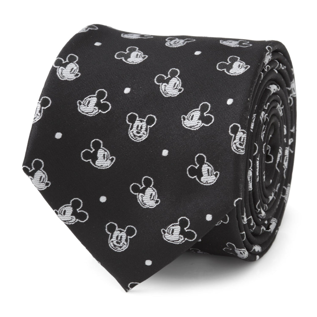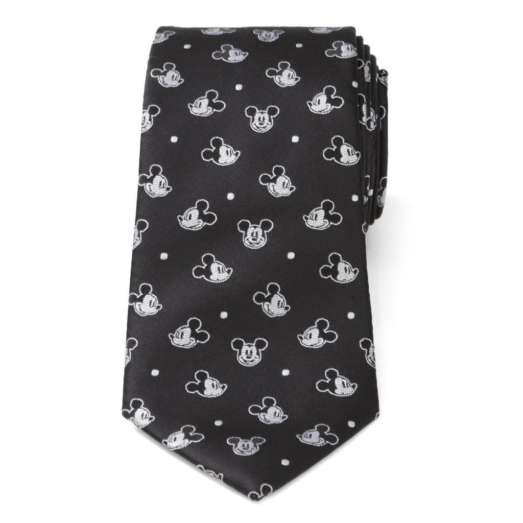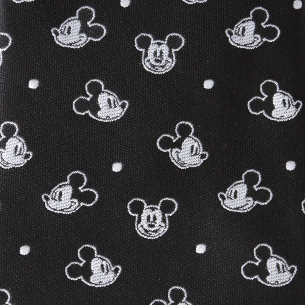 Sleek and simple, this tie doesn't need much to stand out. Sporting different expressions from happy to surprised, Mickey Mouse motifs dominate the pattern with white pin dots to fill in blank space. The contrast between the black and gray is reminiscent of the 1920s when Mickey was first introduced on black and white television. This tie will maintain its shape and hold a perfect knot thanks to being crafted with durable yet soft 100% Polyester. Officially licensed by Disney.