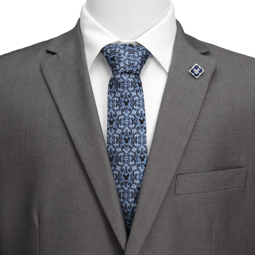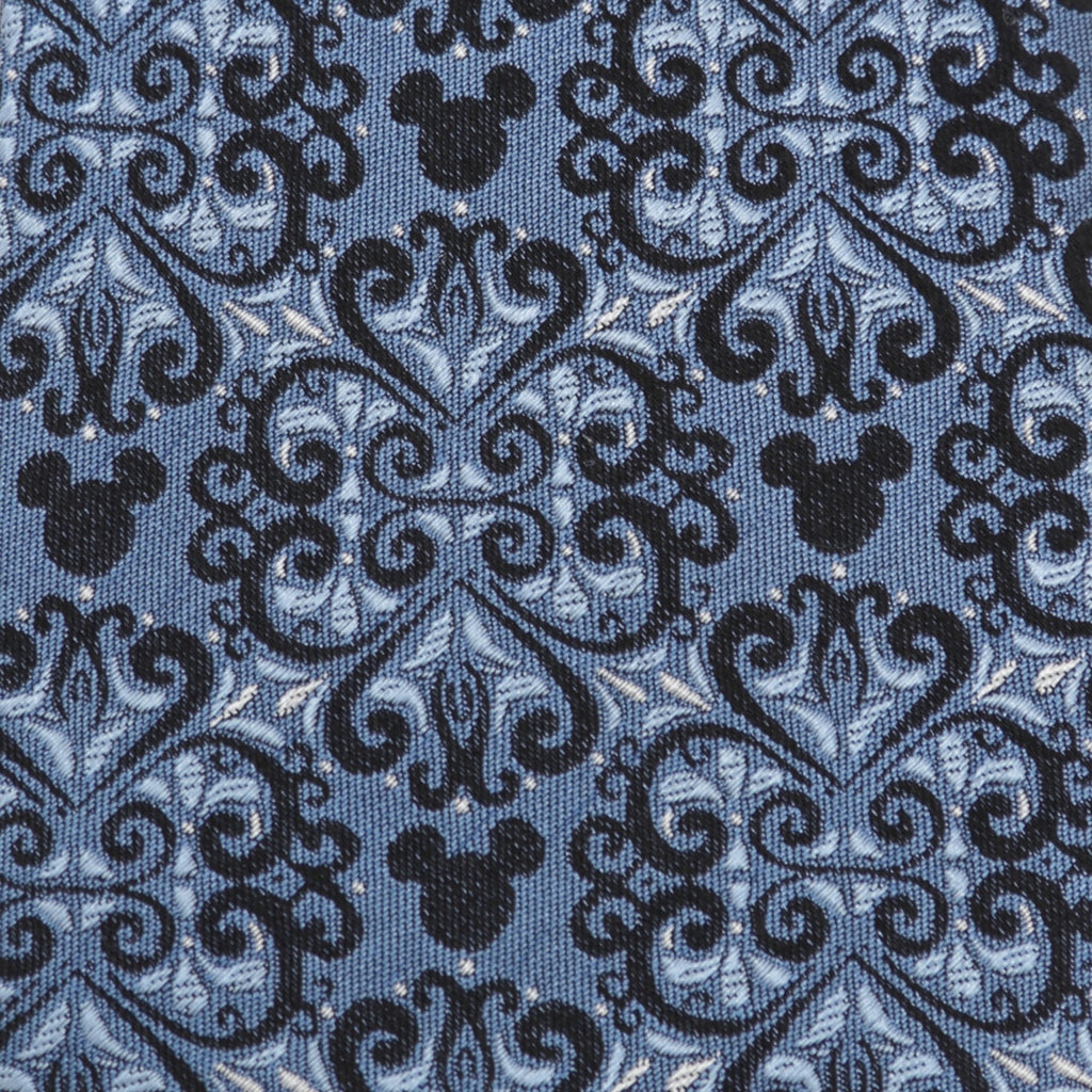 Elevate your neck tie game with this luxurious 100% silk tie, featuring an elegant blue damask pattern woven around a series of black Mickey Mouse icons. An ideal gift for yourself or the mature Disney fan in your life. Officially licensed by Disney.