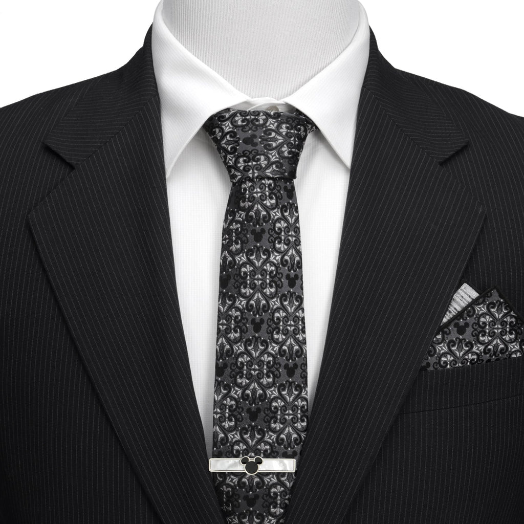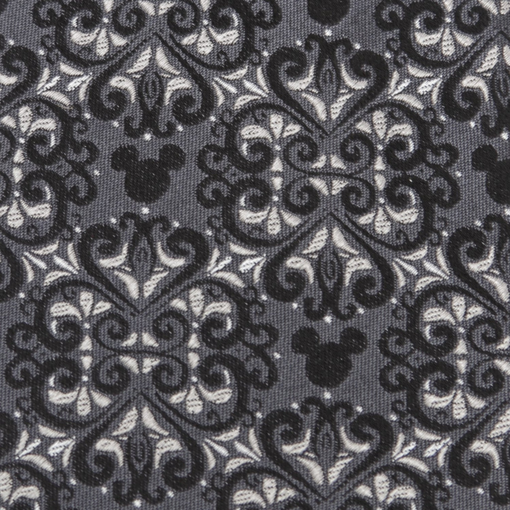 Stylish, Silk, and very professional with a little Disney magic woven into the pattern, this tie features an elegant slate gray and silver damask pattern surrounding a series of black Mickey Mouse motifs. An ideal gift for yourself or the mature Disney fan in your life. Experience enchantment with our expertly crafted 100% Silk tie. It's built to last, infused with Disney magic, and ready to accompany you on whimsical adventures. Pairs beautifully with our Stainless Steel Black Pave Crystal Mickey Mouse Cufflinks. Officially licensed by Disney.