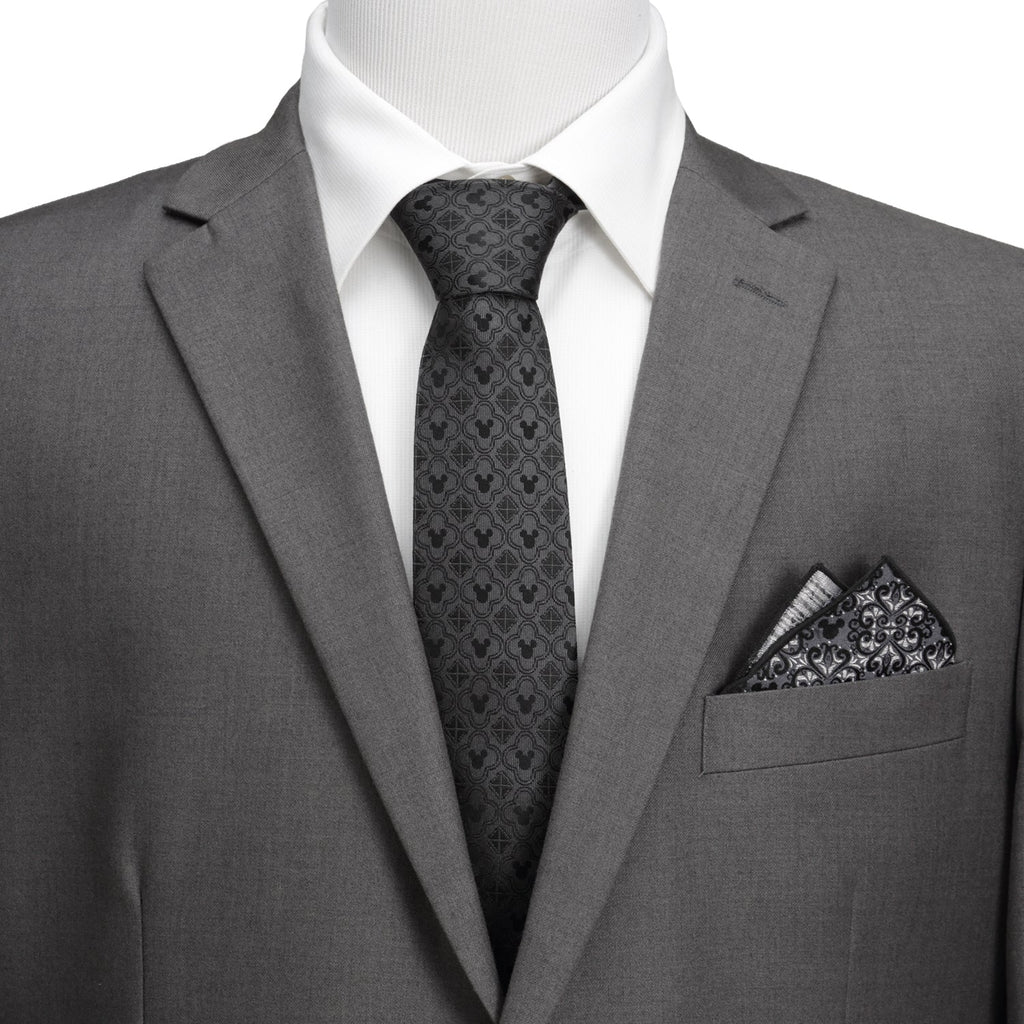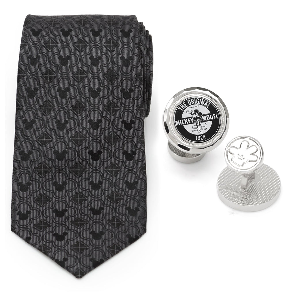 The original. The best. The one and only. Celebrate the legacy of Walt Disney's Mickey Mouse with this set of cufflinks featuring original black and white artwork from 1928, and paired with a 100% silk black necktie with geometric logo pattern. Officially licensed by Disney.