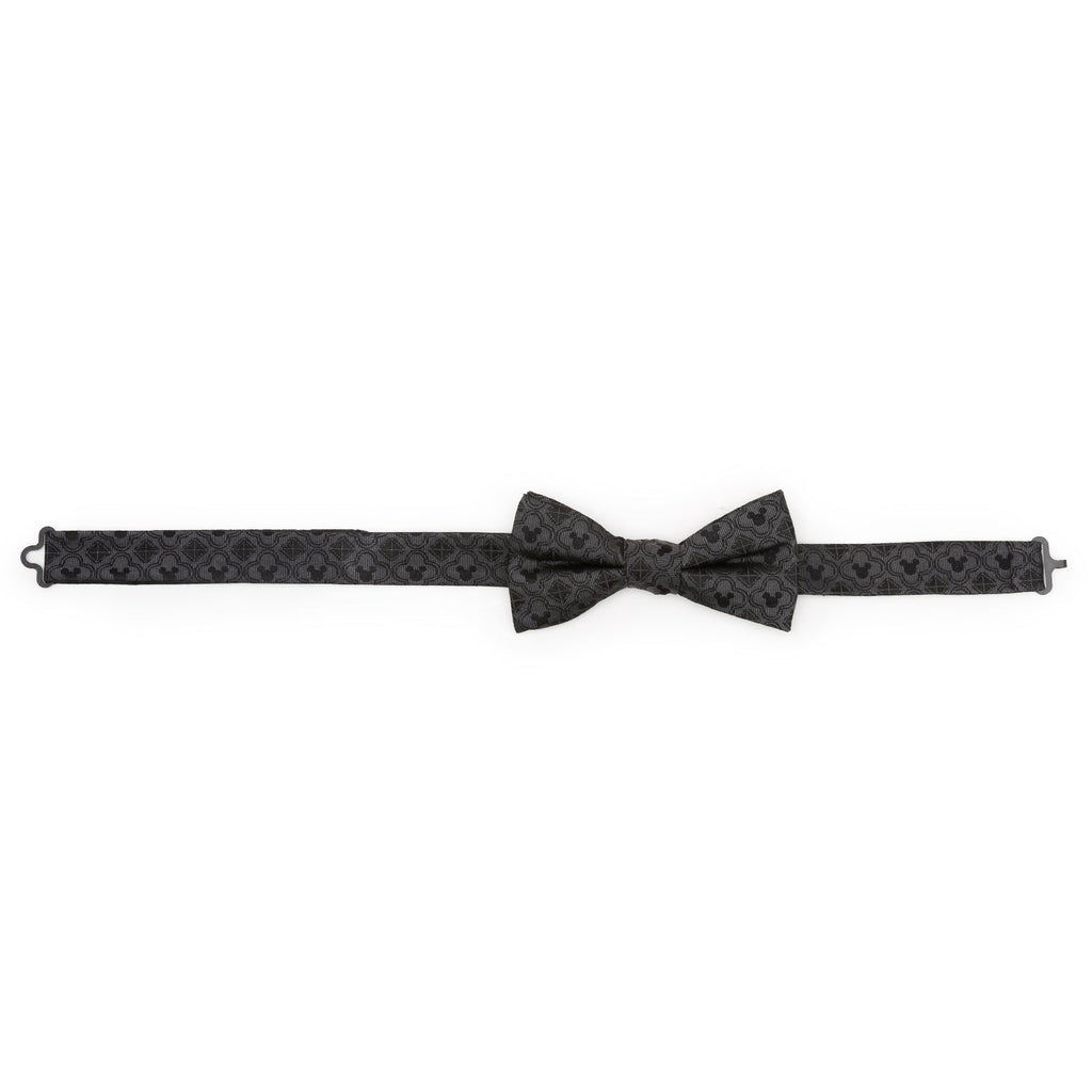 A simple black pattern of Mickey Mouse silhouette motifs, clover shapes, and geometric diamonds helps make our Mickey Mouse Pattern Black Bow Tie an immediate fan favorite. It's subtle enough to wear every day, or to dress up for your next formal event. Experience enchantment with our expertly crafted 100% Silk bow tie. It's built to last, infused with Disney magic, and ready to accompany you on whimsical adventures. Add a touch of whimsy to your journey with this durable and intricately detailed bow tie. Officially licensed by Disney.