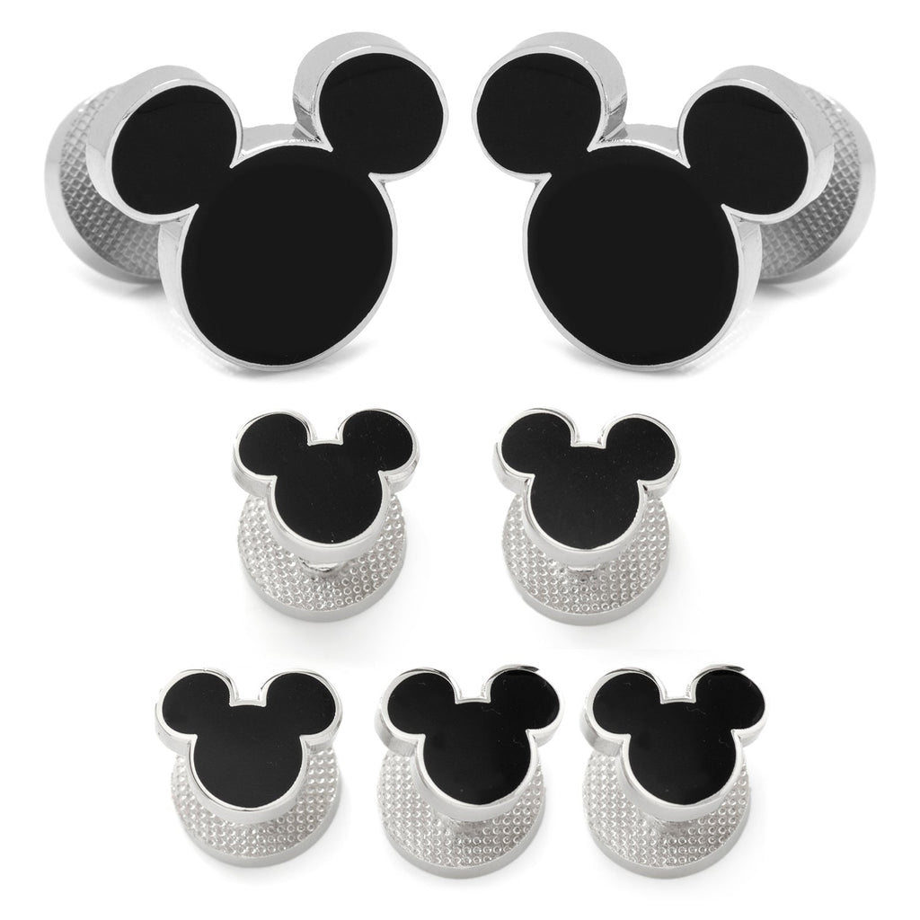 Mickey's iconic silhouette creates the design of our Mickey Mouse Silhouette Stud Set. Sleek black enamel fills in silver plated base metal, creating a shiny silver outline. The fixed backing of both cufflinks and studs have Mickey's helping hand embossed on the reverse side. Experience enchantment with our expertly crafted plated base metal stud set. It's built to last, infused with Disney magic, and ready to accompany you on whimsical adventures. Pair with our matching Black Mickey Mouse Silhouette Tie Bar and Lapel Pin to create the ultimate Mickey Mouse set. Officially licensed by Disney.