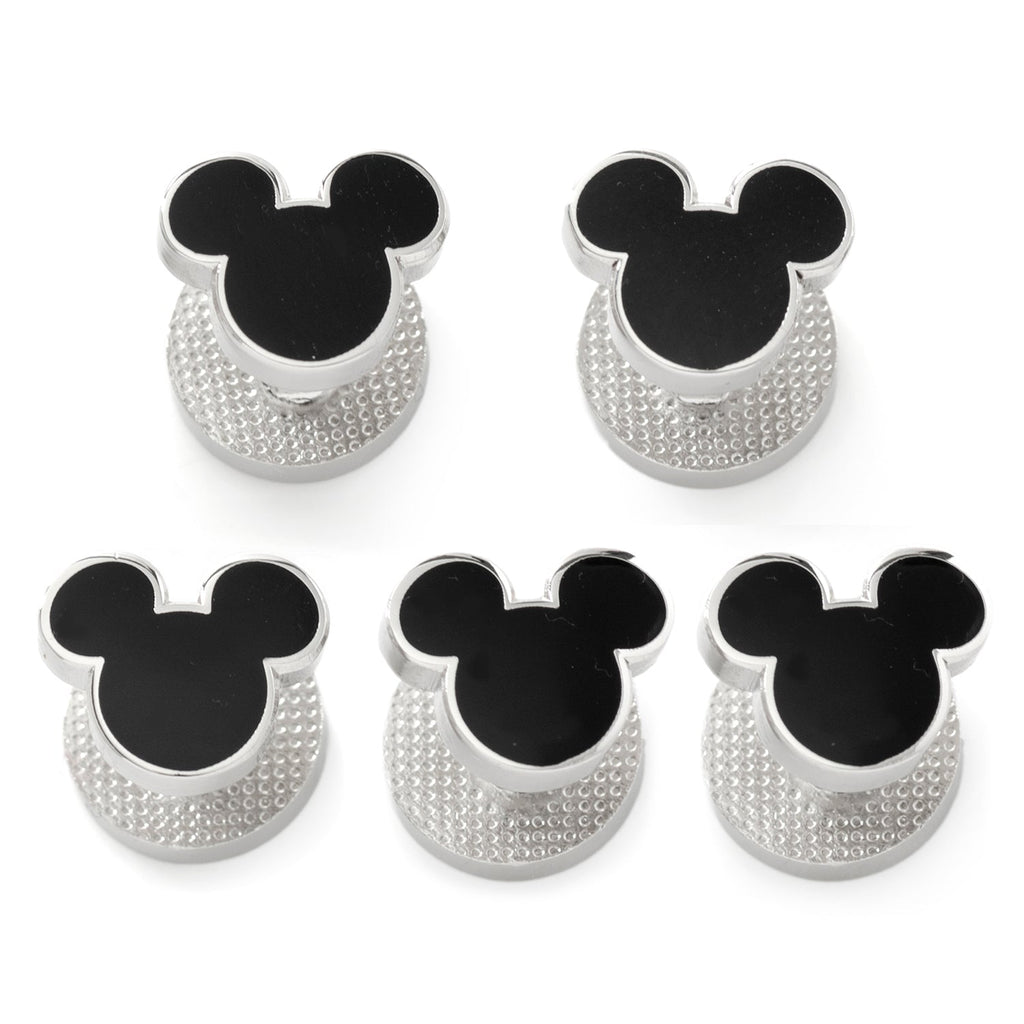 Mickey's iconic silhouette creates the design of this set of four cufflink studs. Sleek black enamel fills in silver plated base metal, creating a shiny silver outline. The fixed backing has Mickey's helping hand embossed on the reverse side. Experience enchantment with our expertly crafted plated base metal studs. They are built to last, infused with Disney magic, and ready to accompany you on whimsical adventures. Pairs perfectly with our Mickey Mouse Silhouette Cufflinks. Officially licensed by Disney.