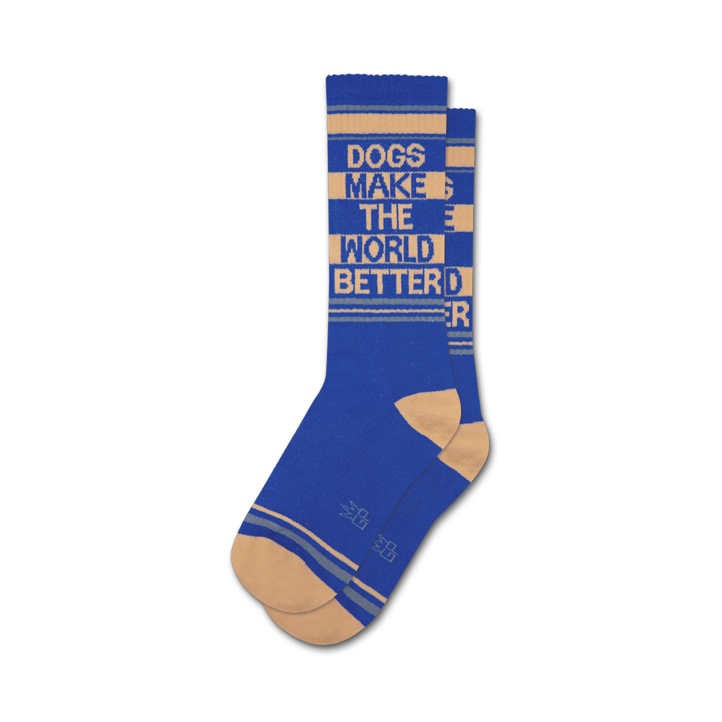 Blue socks with 'Dogs Make The World Better' in a lighter blue. Don't be a bonehead, wear these socks to show dogs love. Blue socks made for men or women to show your love for paws and claws.