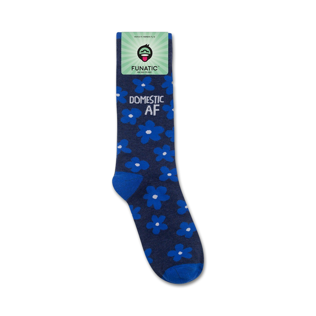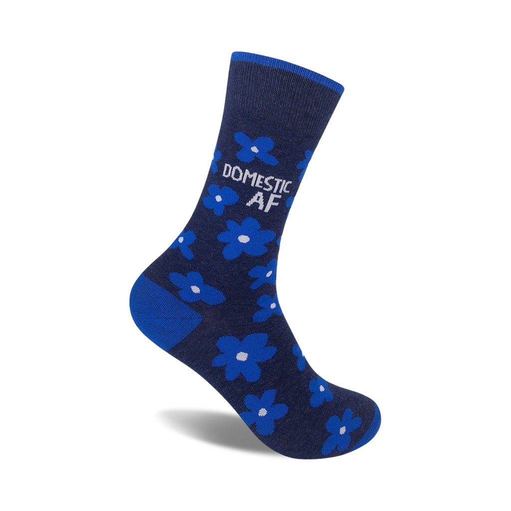 Domestic AF socks: The ultimate in sass and style. These crew socks feature a dark blue background with a pattern of light blue flowers with white centers. The words "Domestic AF" are displayed vertically on the leg of the sock in white. Whether you're rocking them around the house or out on the town, these socks are sure to turn heads and make a statement. Show off your domestic prowess and let the world know that you're the queen of clean sheets and a well-stocked pantry.