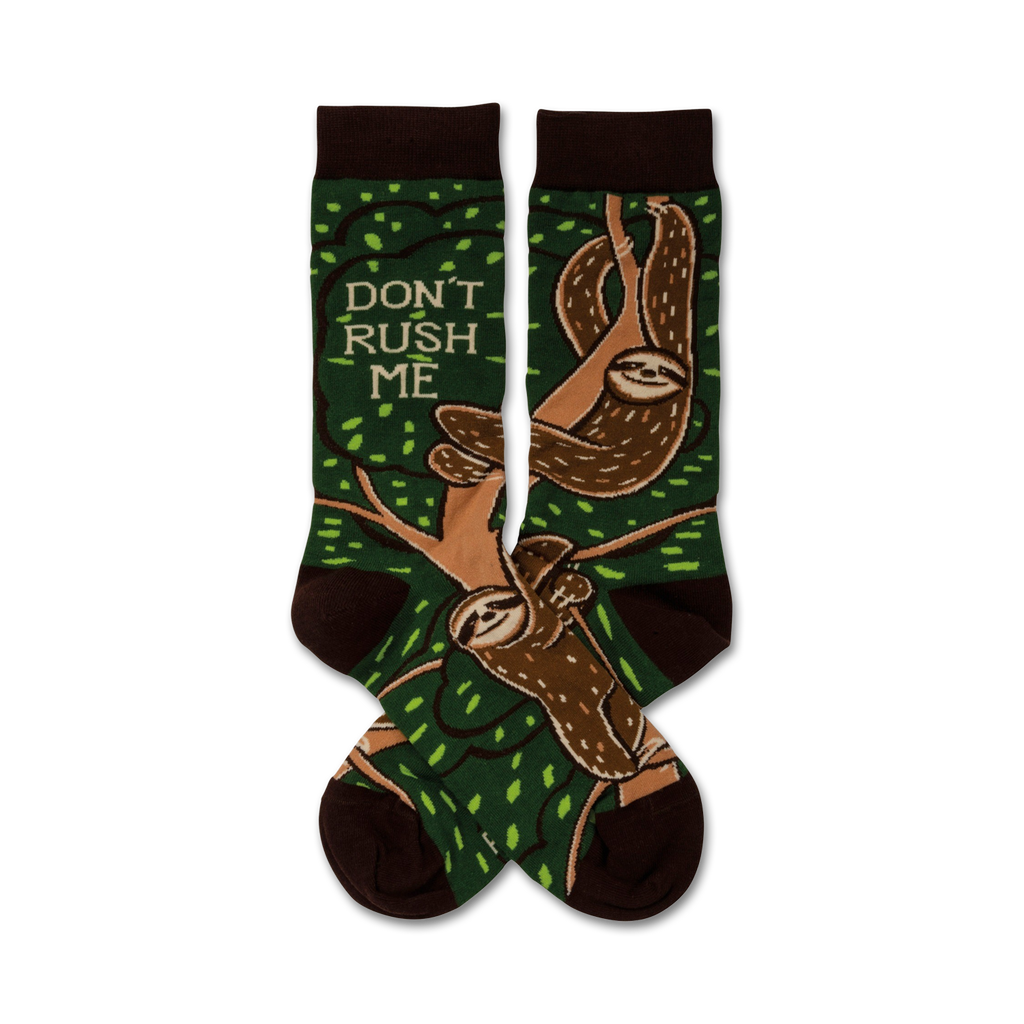 Sloths are the ultimate chillers, known for their laid-back attitude and slow-paced life. Step into a pair of these brown and green Don't Rush Me sloth socks, featuring adorable sloths hanging from tree branches, and let the sloth vibes take over. Whether you're lounging at home or out running errands, these comfy crew socks will keep you cozy and remind you to take it easy. So, slow down, embrace the sloth life, and say "Don't Rush Me" with every step.