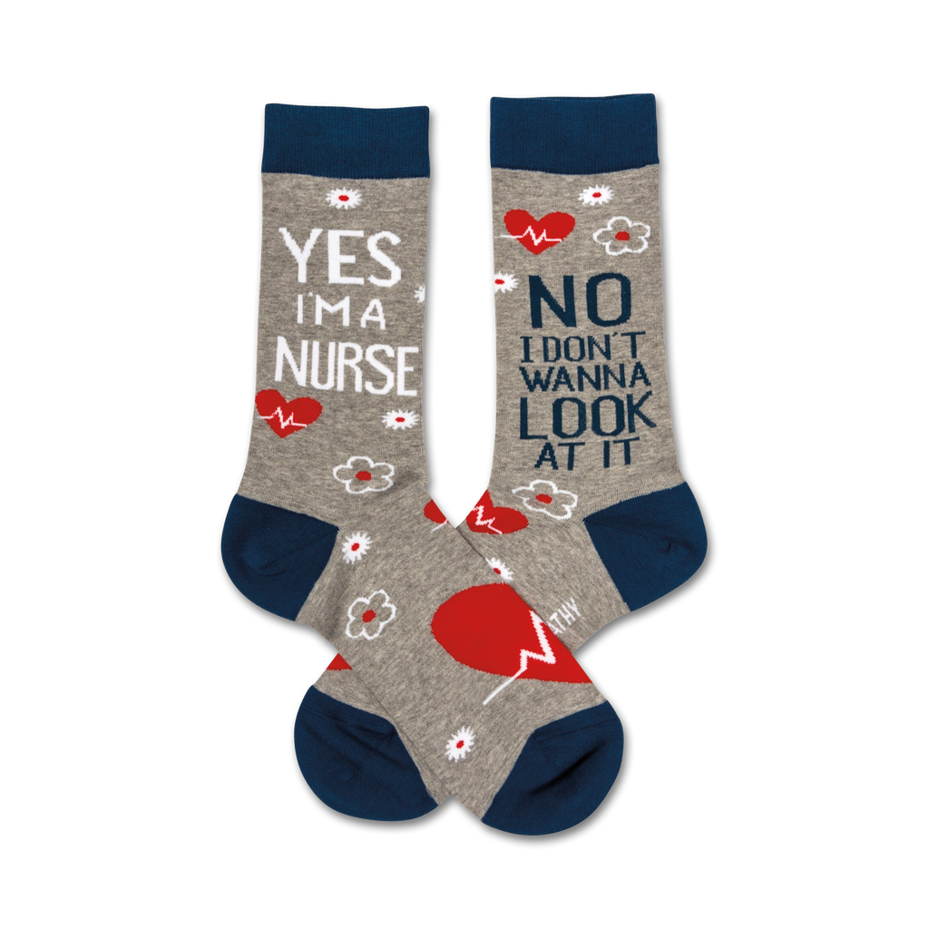 You may not be able to save a life today, but you can save your style by slipping into these "Don't Wanna Look" nursing socks. With the bold message "YES I'M A NURSE...NO I DON'T WANNA LOOK AT IT" emblazoned on the sides, these sassy gray socks with blue toes, heels, and tops will leave no doubt about your love for your job and your sense of humor. And if that's not enough to brighten your day, the smattering of white flowers and red hearts with white polka dots will surely do the trick!