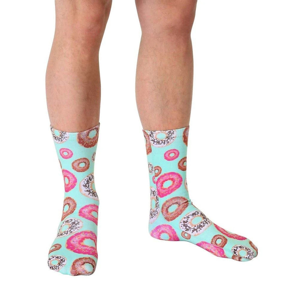 These 'Donuts' socks are pretty sweet. The visible portion shows a pastel mint green background with a fun pattern of donuts in pink, brown, and white. Some donuts have sprinkles. They're crew socks, shown on a model's legs. Perfect for adding a touch of whimsy to your day, or just because donuts are awesome. They're comfy enough for all-day wear, but stylish enough to be seen.