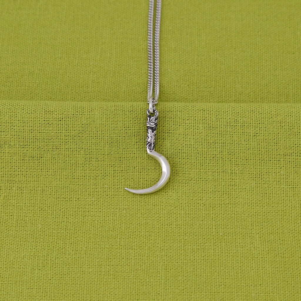 Handcrafted in solid sterling silver and antiqued to accentuate the ornate detail, the Boline silhouette represent the Druid character class icon brought to life. The ritual knife features a wood-textured handle depicting sculpted oak leaves, with the curved blade bending dramatically in its signature sickle shape.