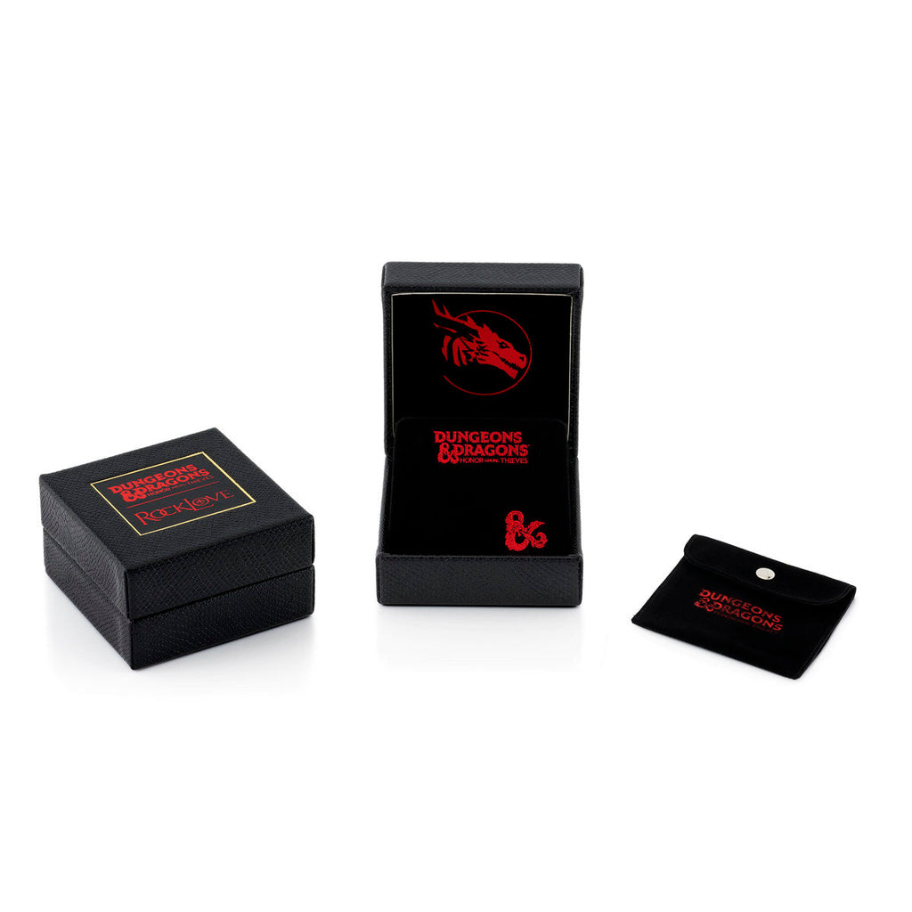 This Dungeons & Dragons X RockLove jewelry design is open edition and commemorates the feature film Dungeons & Dragons: Honor Among Thieves. Every piece arrives in a signature Dungeons & Dragons: Honor Among Thieves Box, featuring black embossed dragon scale exterior and signature red and gold metallic silkscreened branding throughout. Soft black flocking protects your RockLove jewelry and includes a matching Dungeons & Dragons: Honor Among Thieves branded luxury travel pouch.