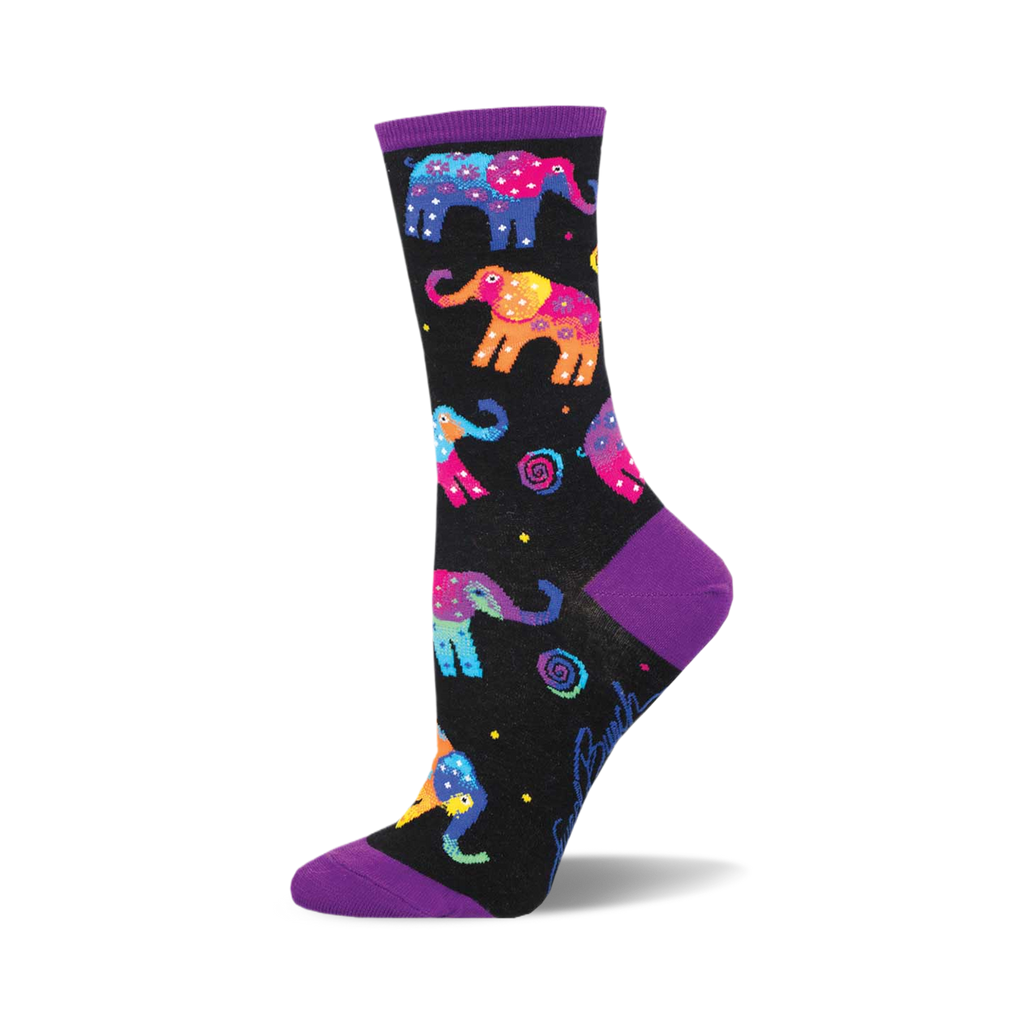 Unleash your inner pachyderm party with Ellies! These cheerful crew socks are sprinkled with a delightful parade of multicolored elephants dancing under a sky of twinkling white stars and delicate yellow and white flowers. Crowned with a bold purple top, they're perfect for brightening your everyday wardrobe or jazzing up your outfit at your next funky gathering. Why blend in when you can stand out? Grab a pair of Ellies and let your feet trumpet fun and fashion!