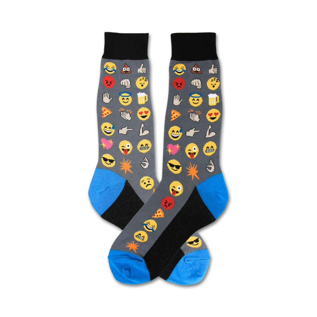 Putting on a pair of these gray Emoji socks with blue toes and heels is like bringing your phone's emoji keyboard to life! Picture it: smiling faces, hearts, hands, and food galore. You'll feel like you're texting from your feet. These men's crew socks are the best way to show off your playful side and are sure to give you the feels.