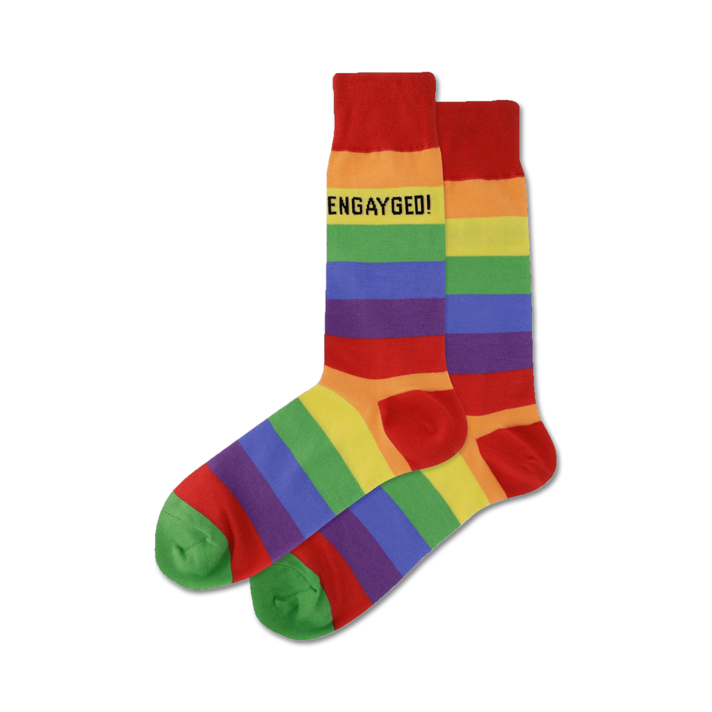 Engayged Socks: Show your pride and step out in style with our vibrant rainbow socks emblazoned with the word "ENGAYGED!" in bold black letters. These socks are a celebration of love, equality, and the LGBTQ+ community. With their green toes and heels, these socks are sure to turn heads wherever you go. So put on a pair of Engayged Socks and let your feet do the talking!