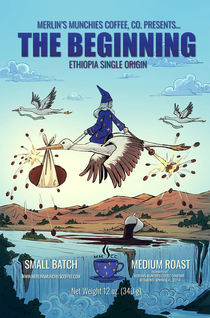 This medium roast Ethiopian Yirgacheffe coffee is harvested at an elevation of 5200-6400 ft. When sipping, expect cupping notes of a bright, floral fragrance, clean citrus acidity, gentle berry or wine-like fruit notes, and a soft, smooth body, with hints of chocolate, nutty, or herbal undertones. Ethiopia is likely the birthplace of coffee. Legend has it that a goat herder named Kaldi was out in his fields when all of a sudden, his goats began jumping around, excited. Kaldi noticed a small shrub with red berries was the source of their excitement... He tried the berries, which happened to be coffee, and felt great! Later he took them to a group of monks, who disregarded the coffee cherries by throwing them in a fire. Legend has it, once in the fire, a lovely aroma wafted in the air, and Earth's coffee obsession began! Although, MAYBE... Just maybe... there is another origin story where a wizard and his stork populated Earth with their coffee beans, bringing happiness to all! This may or may have not happened on your planet, but rest assured it has occurred somewhere in the Multiverse!