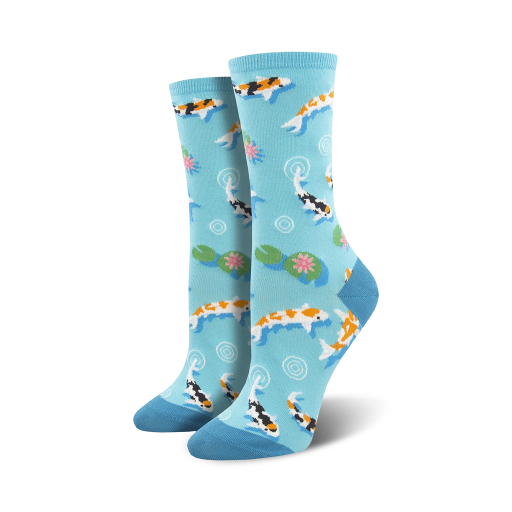 Koi Fish Socks: A Splash of Zen and Style These Every Now and Zen crew socks feature koi fish swimming gracefully among green lily pads. With their bright orange and blue hues, they are a fun and stylish way to add a touch of Zen to your everyday look. Plus, the durable fabric ensures lasting comfort and style, making them perfect for men or women.