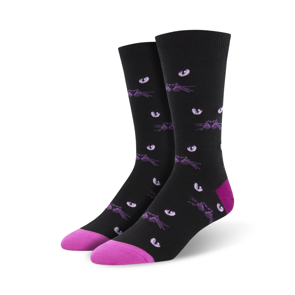 Felines fancy footwear? Eyeing You socks got you covered! Sock it to 'em in these attention-grabbing socks featuring a pattern of cartoonish cat eyes with purple irises and outlined in purple. The black socks have purple toes and cuffs. Show off your feline fanaticism with these crew socks for men. Purrfectly eye-catching, these socks will leave all other cat-themed socks in the dust. Get ready to steal the show and make a striking statement wherever you go.