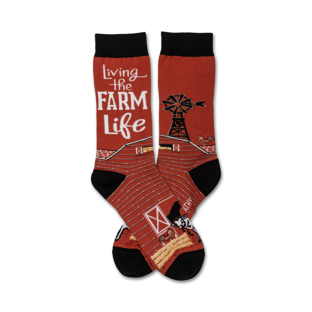Put on a pair of these FARM LIFE red socks with black toes and heels and white windmills, barns, and farm animals and be reminded of a simpler life. Whether you're actually living the farm life or just dreaming of it, these crew socks for men and women will show the world that you're down-to-earth. Grab a pair of these comfy crew socks featuring a farm scene and add some fun to your everyday style.