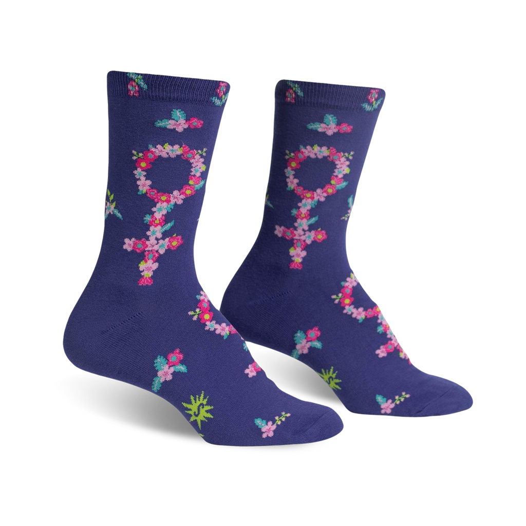 Plant your feet and bloom with Girl Power! With these purple crew socks, you'll step through life with the symbol of femininity and tenacity adorning your feet. Each pair features an eye-catching pattern of pink and green flowers, symbolizing the strength of the female spirit. These socks are a blooming reminder that with every step, you're pretty powerful!