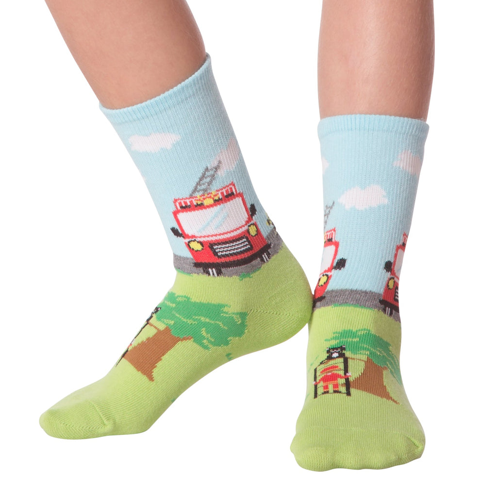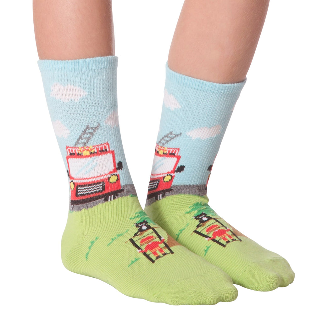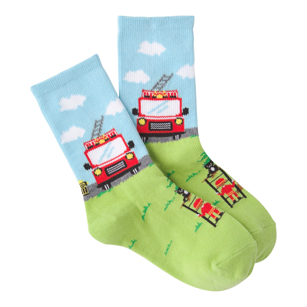 These 'Fireman' socks are seriously cute. The visible portion shows a light blue top with a cartoon firetruck and clouds. The bottom is a lime green with a firefighter and what looks like a tree. It's a fun, playful design - perfect for little ones (or big kids who still love firetrucks!). They're crew socks, and the colors are bright and cheerful. Get ready to put out some serious style.