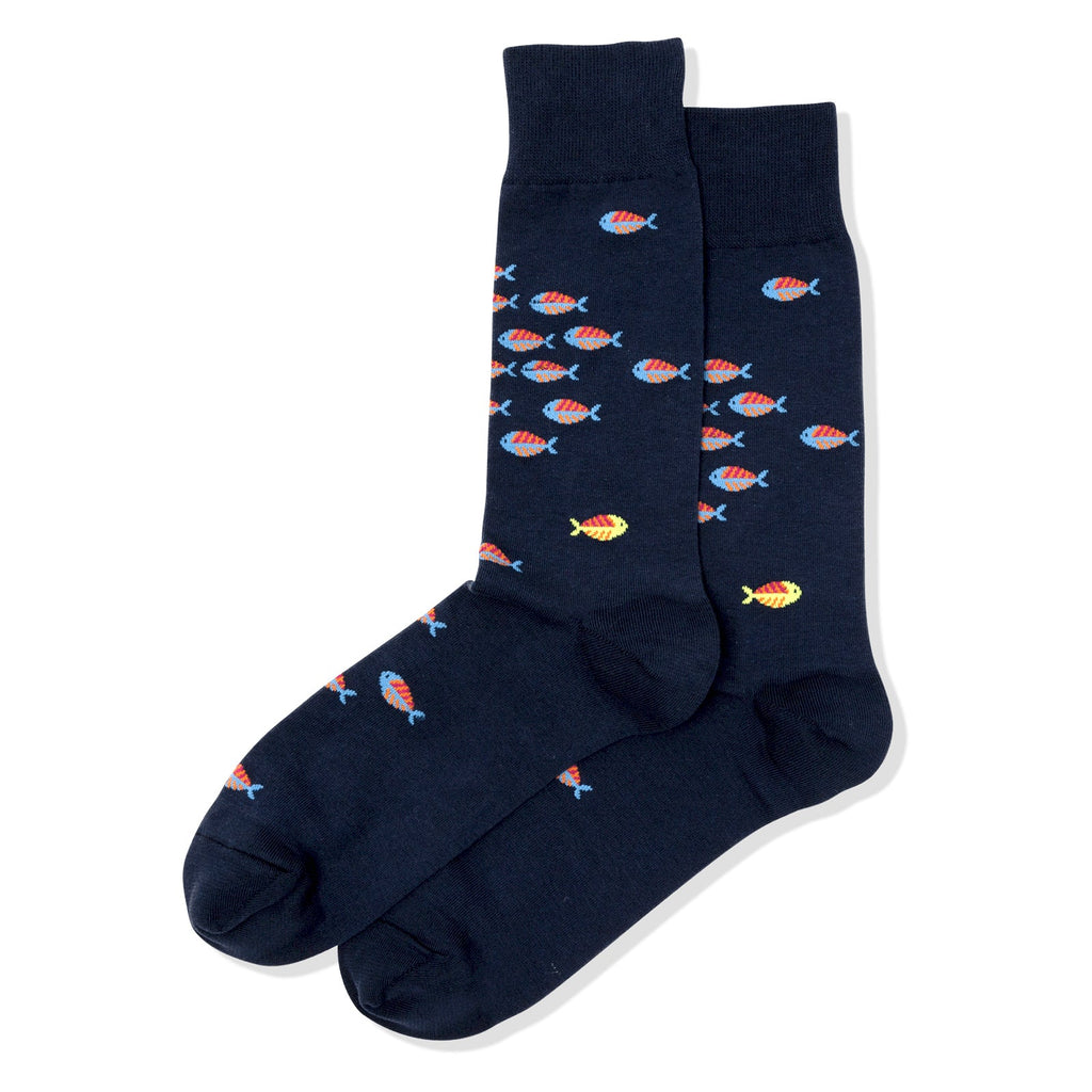 These 'Fish' socks are a navy blue- the perfect shade for a deep sea adventure, or just a Tuesday. They're shown with a pattern of little fish- some orange and red, some blue- swimming across the fabric. A couple of yellow fish stand out from the school. The visible part of the socks seems to be a fairly standard crew sock length. These aren't your grandma's argyle- they're fun and quirky without being too loud.