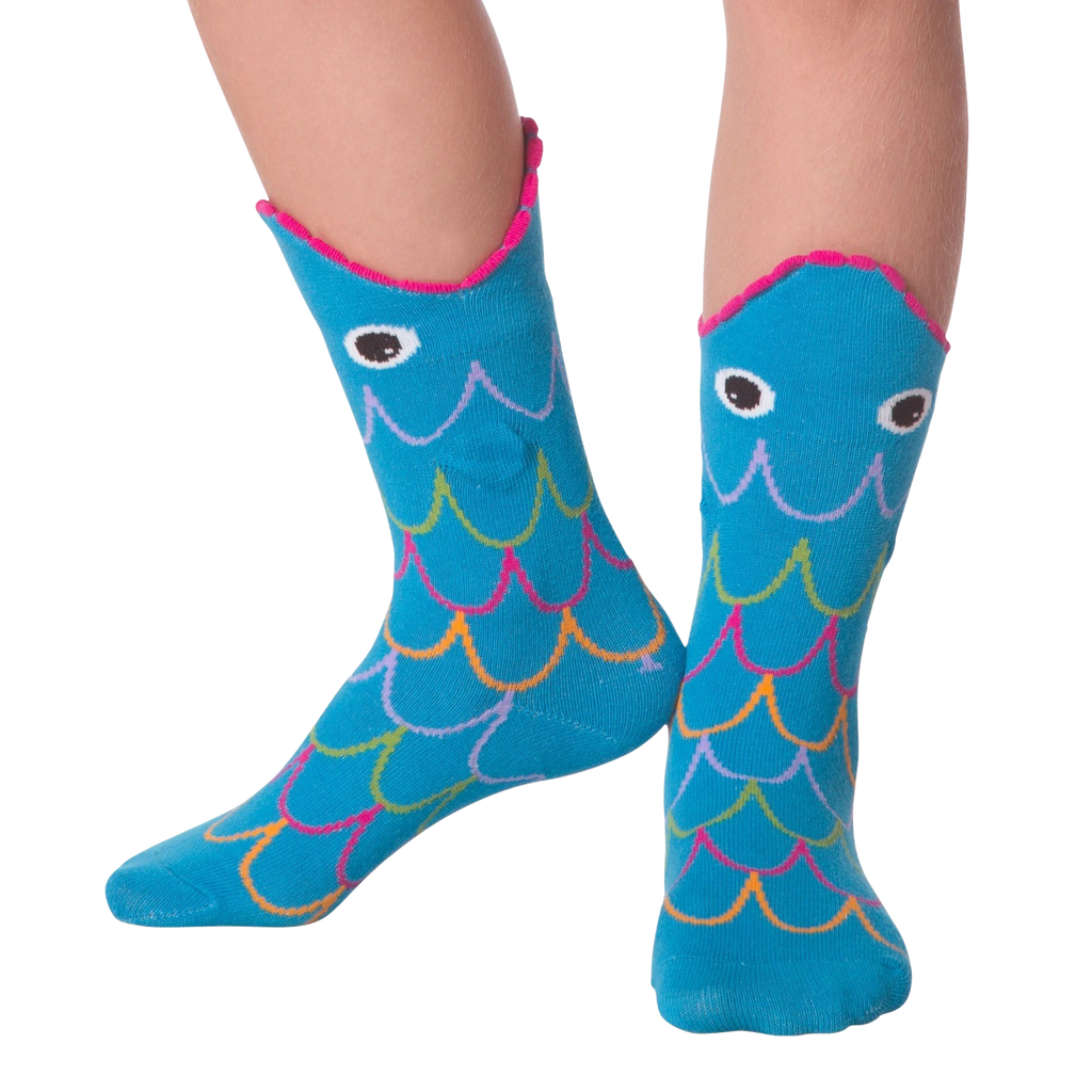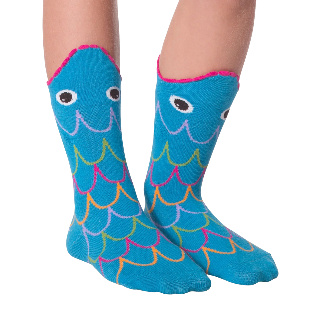 Let your feet swim in style with our Fish Wide Mouth crew socks! Designed with a vibrant pattern of multi-colored fish scales and adorable pink-mouthed fishies with googly eyes, these socks are sure to make a splash wherever you go. Perfect for kids who love the underwater world, these socks will have them swimming in compliments all day long.
