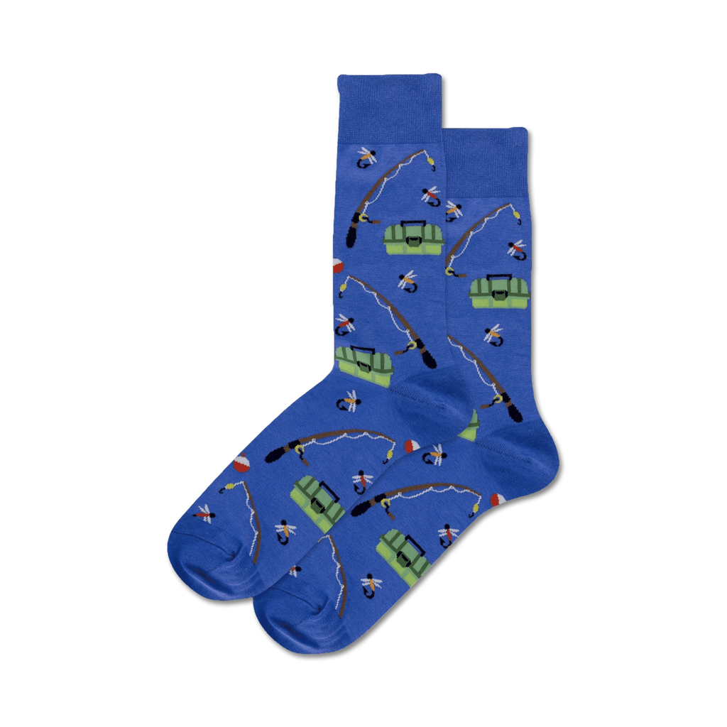 Calling all anglers and fishing enthusiasts: dive into a sea of style with our Fishing Tackle Box Crew Socks! These cool men's socks feature an eye-catching pattern of green and brown fishing tackle boxes, fishing poles, and tiny fish. Wear them as a fun reminder that even when the fish aren't biting, you can still reel in a great catch. Every pair of these comfy crew socks is designed to make a splash, whether you're casting a line or just kicking back. Plus, they're guaranteed to make a big impression, so get ready to hook compliments wherever you go.