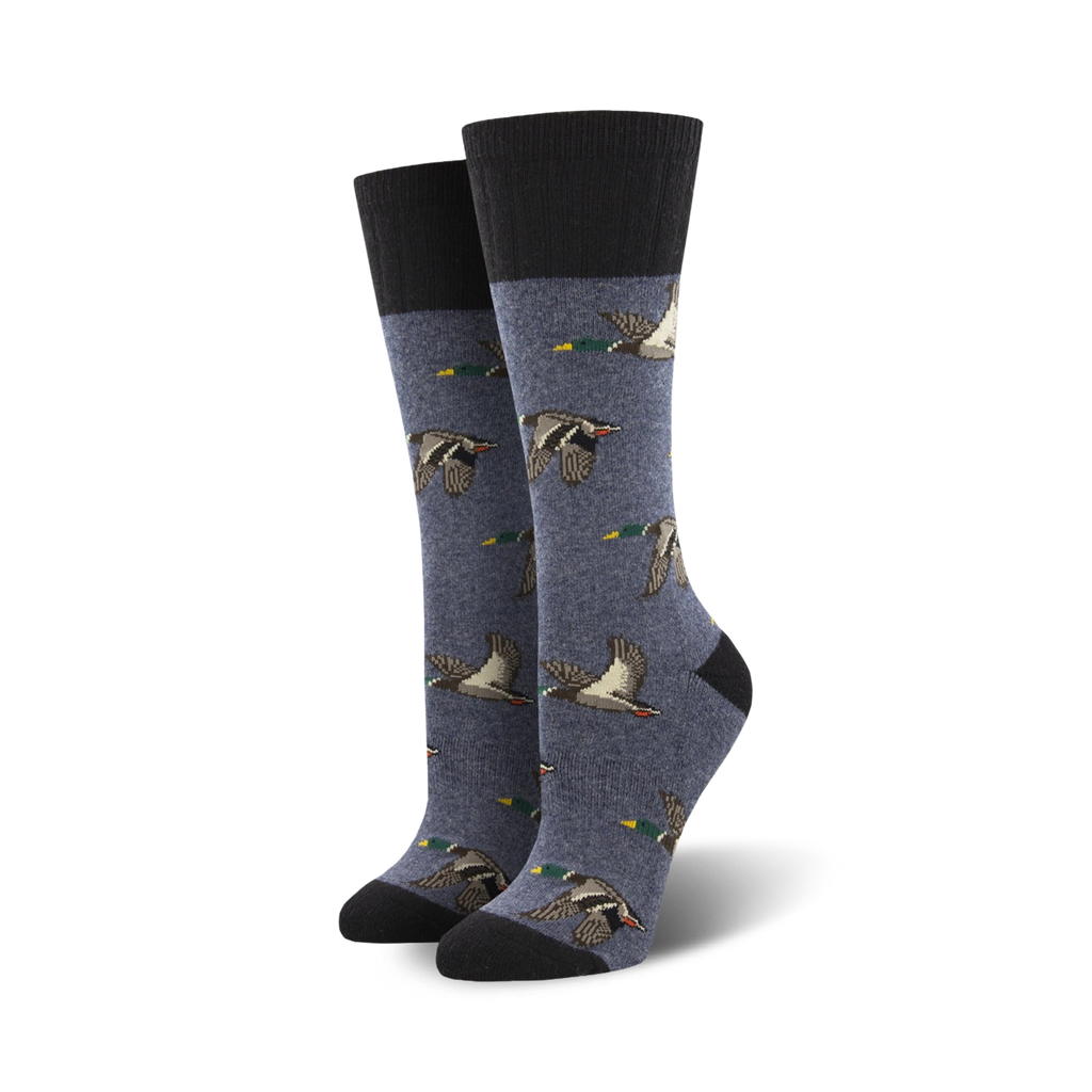 Duck, duck, goose! Take to the skies in these Flight Pattern Wool socks, featuring a flock of adorable flying brown and teal ducks against a dark blue background. Perfect for any bird lover, these crew-length socks are sure to become your new favorites. Fun fact: mallard ducks can fly up to 60 miles per hour!