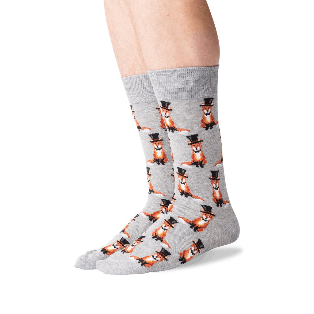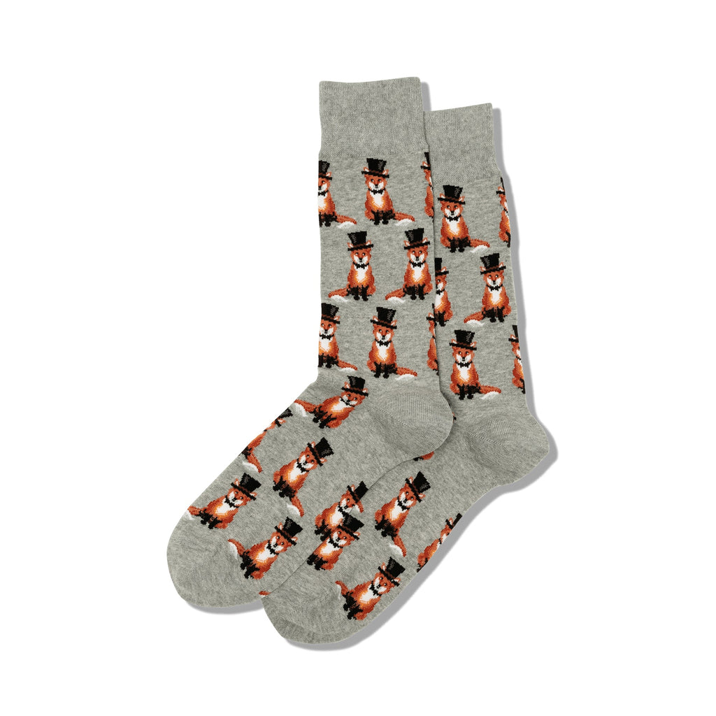 Check out these Foxy Groom socks! They're a heather gray with a repeating pattern of foxes wearing top hats and bow ties. Pretty dapper, huh? The foxes are orange and the hats are black. The socks shown are crew socks; you can see the tops are gray as well. They're comfy and fun – perfect for adding a touch of whimsical style to your everyday look. Honestly, who doesn't love a fox in a top hat?