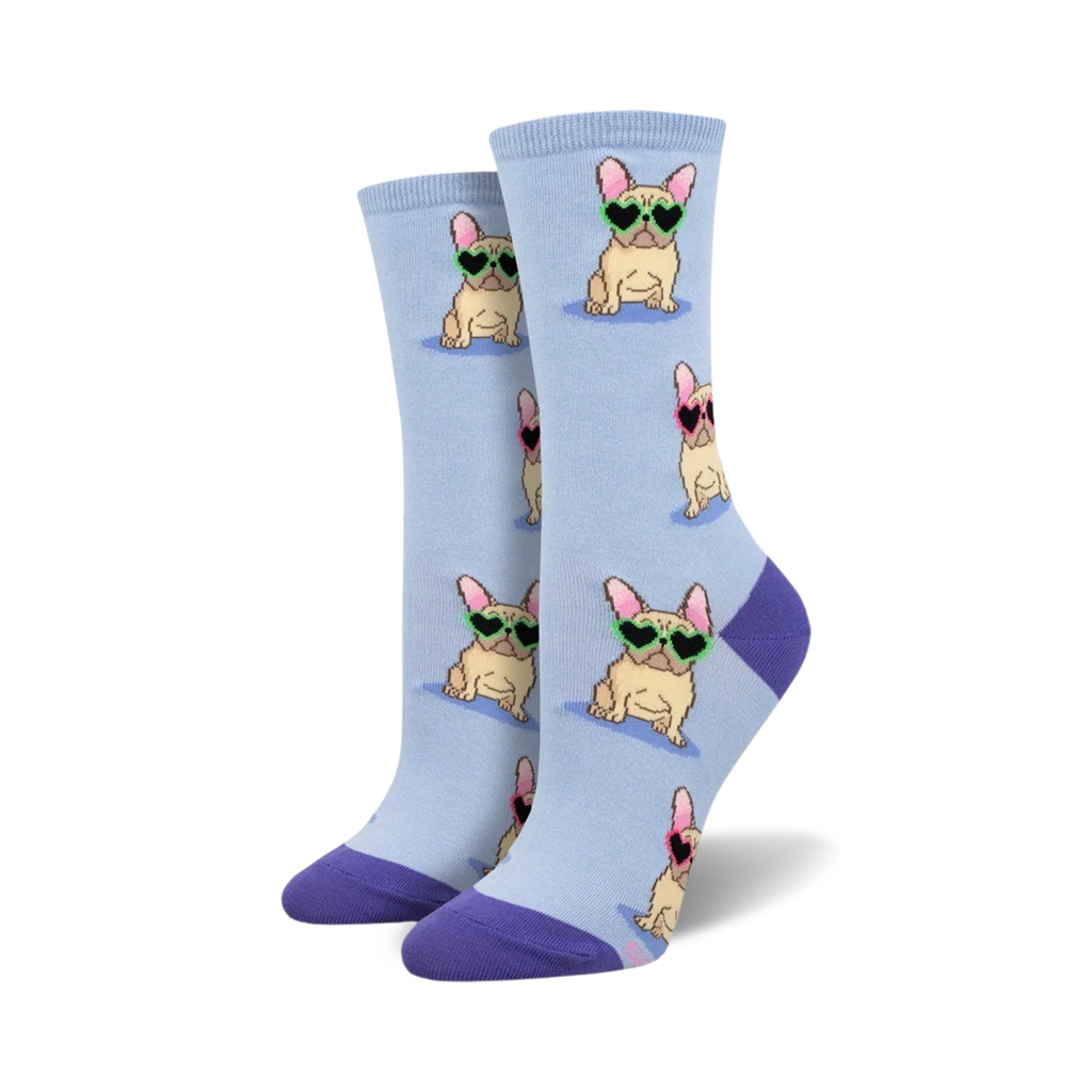 Show off yourFrenchie side in these stylish and whimsical Frenchie Fashion socks. Featuring a delightful pattern of cartoon French bulldogs adorned with heart-shaped sunglasses, these socks are sure to bring a playful pop of personality to any outfit. They're the perfect way to dress up your casual wear or add some fun to your workday look. Plus, with their comfy construction and durable materials, you'll be strutting your stuff all day long in these paw-some socks.
