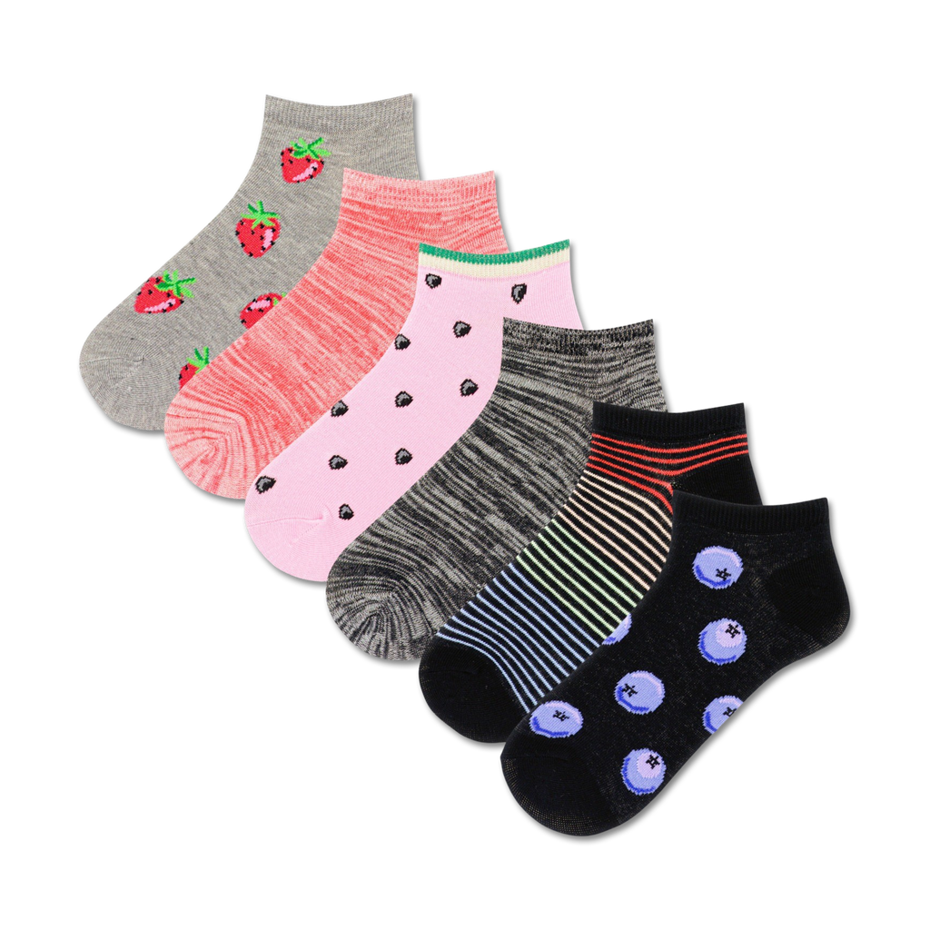 Bold and bright, these socks are just the thing for when you need a splash of color in your life. Featuring a collection of fruity favorites like juicy strawberries, plump blueberries, and more, all set in a rainbow of colors, these socks will turn any gloomy day into a sunshiny day. They're the perfect way to put a spring in your step and an even bigger smile on your face.