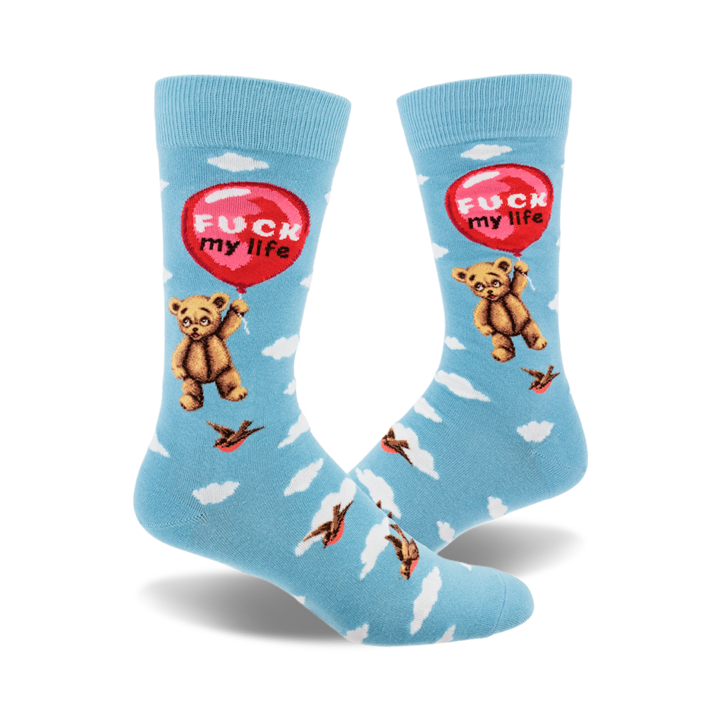 Float away from the mundane with every step! Nestled on these delightfully audacious socks, our bear buddy silently ascends into the azure heavens, hoisted by none other than a vibrant red balloon. But this isn't just any balloon. Emblazoned with a bold "Fuck My Life," it's a whimsical nod to those days when the only way up is literally up. Don a pair, and let your feet do the talking — no explanations necessary, just a sky-high escape with a side of sass.