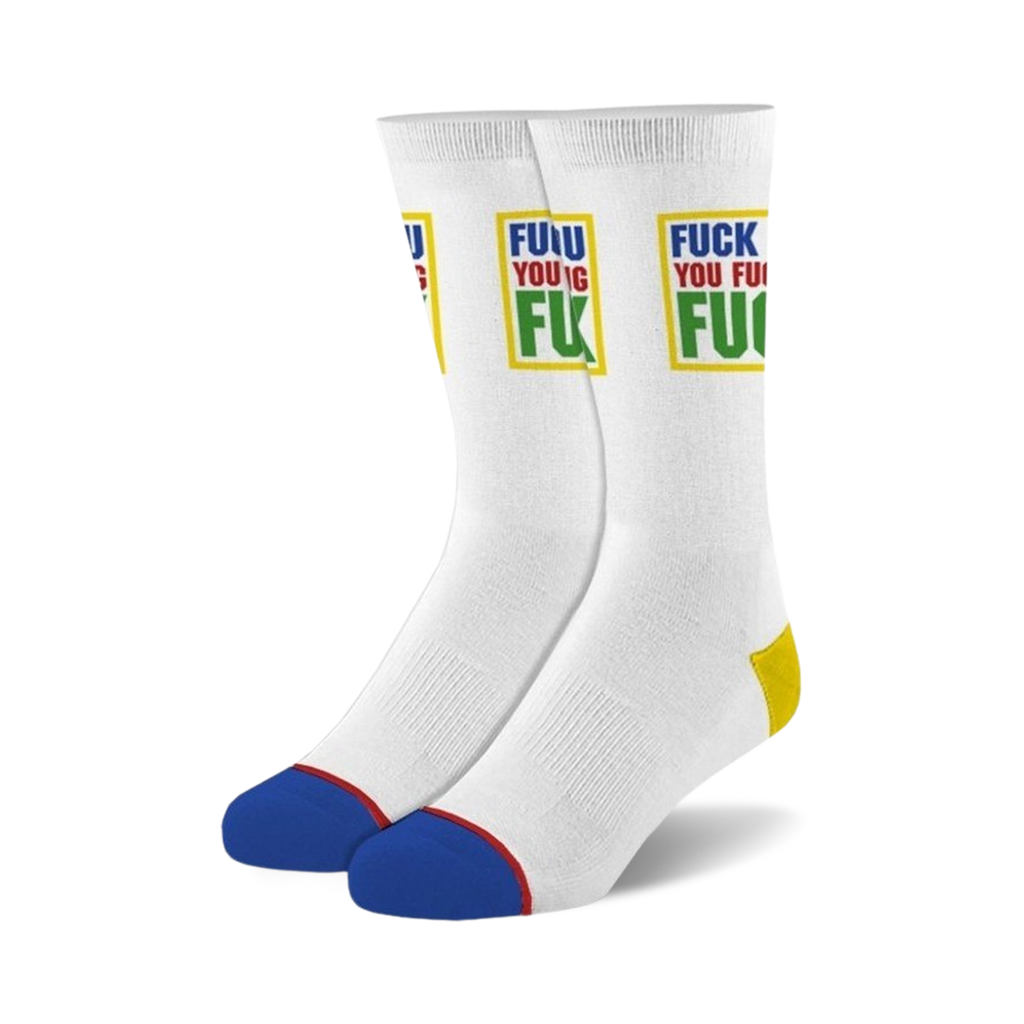 Step into these socks and declare your sentiments loudly. It's bolder than a bullhorn, more vivid than a siren, and less likely to get the cops called on you. The blue toes and heels add some pop, and the yellow heel tab makes it easy to put them on and take them off. Whether you're at work, at home, or in the wild, flaunt these socks and be the life of the *F-ing* party. Show everyone that you're not one to suffer scallywags and scoundrels gladly.