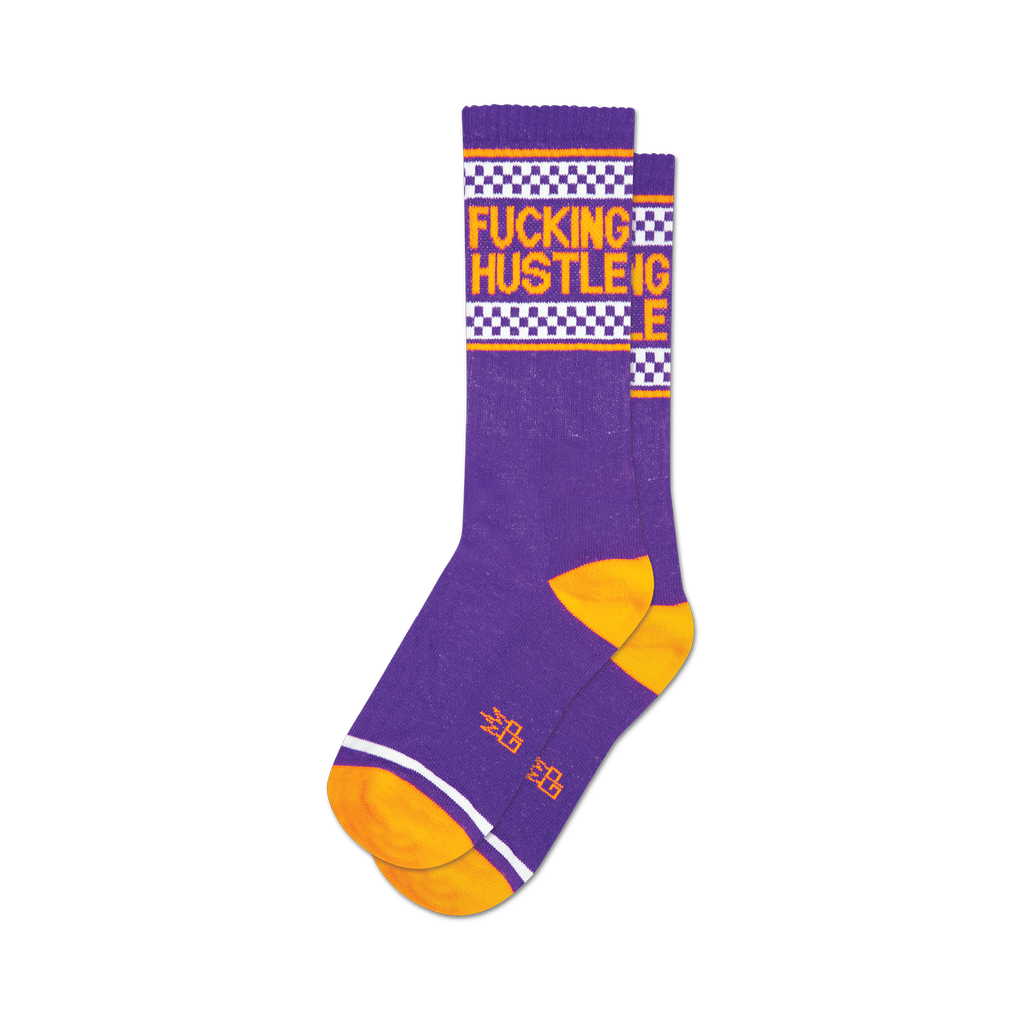 Looking to add a dash of daring to your drawer? Our Fucking Hustle socks aren't just a pair to wear; they're a statement to share! Flaunt your fearless side with bold purple colors highlighted by striking orange heels and toes. But lean in closer - there's a cheeky surprise woven right in. Perfect for the boardroom (if you dare) or a bar night with friends, these socks promise to keep your spirit as charged as your steps. Got a marathon, literal or figurative? Pull on a pair of these and sprint ahead in style. Why whisper when you can roar with your wardrobe?
