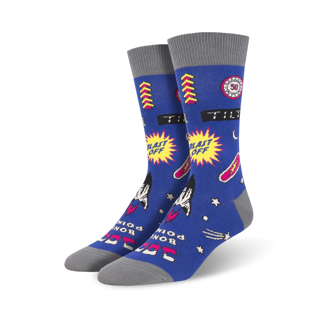 Blast off to a gaming universe with our Full Tilt socks! These space-themed socks feature rockets, stars, and the go-getting motto "Blast Off". The blue background and gray toes and heels of these crew socks will remind you to level up and fearlessly explore new worlds. Get your pair of Full Tilt socks today, and let the adventure begin!