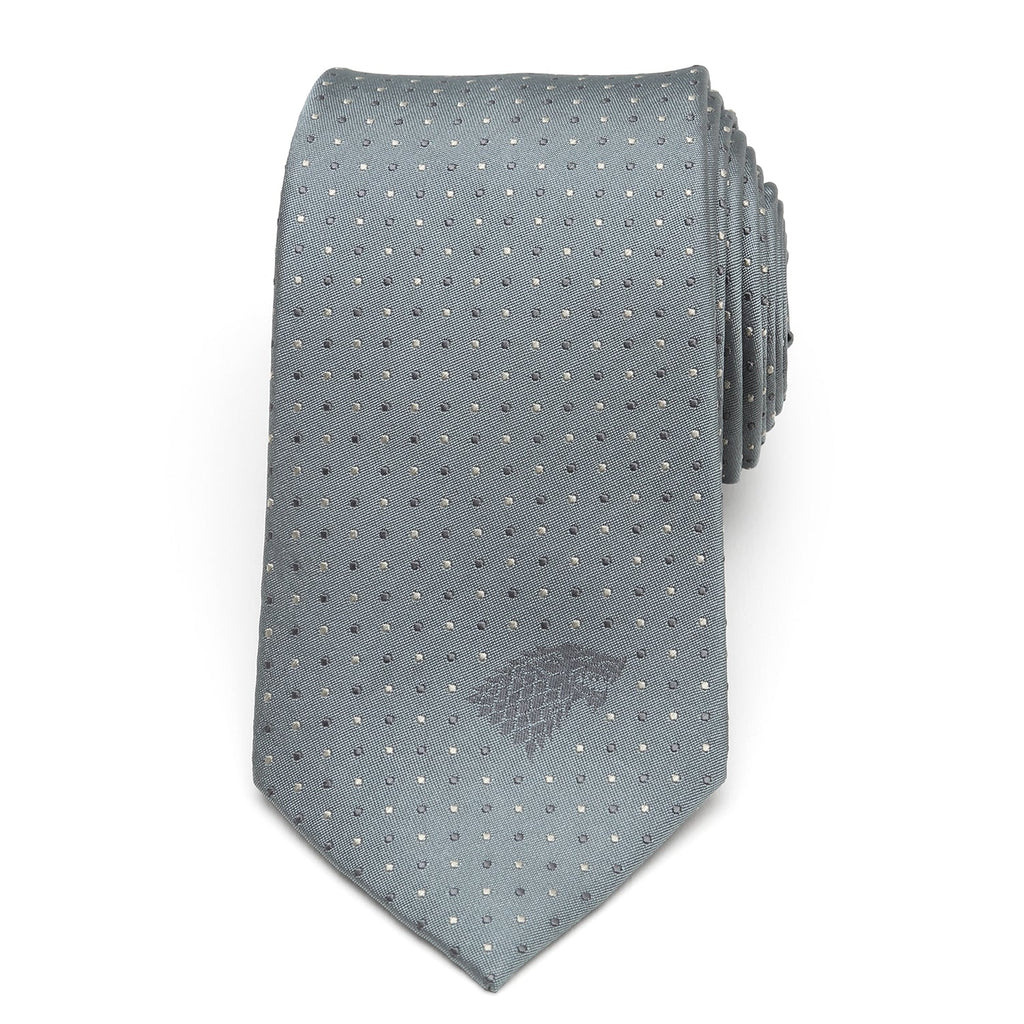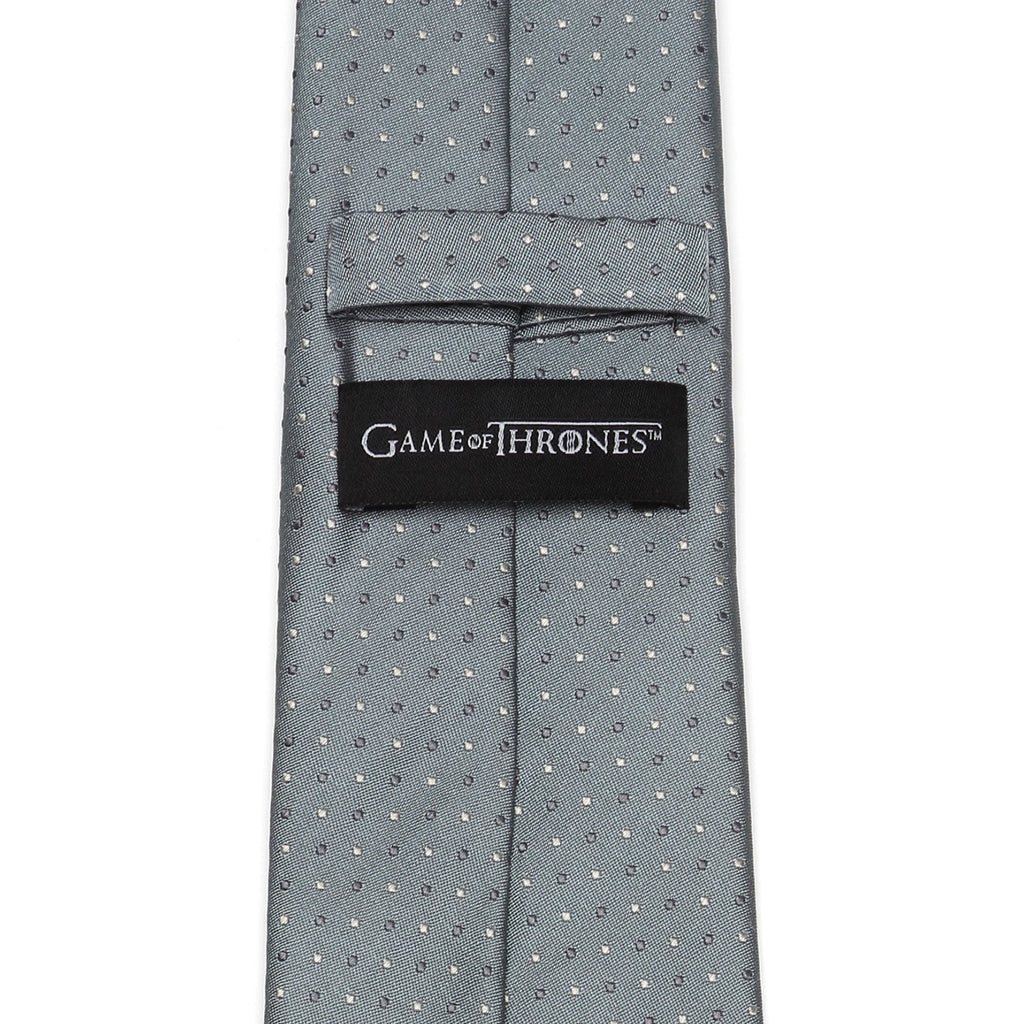 A gray-hued pale mint green is the featured color on this slim 100% silk tie. A House Stark direwolf growls at the wearer from its discrete position at the tie's peak, while a series of gold and silver-toned dots have been carefully stitched to ensure a smooth running knot. Discover the official Game of Thrones logo on the reverse and mix up your accessories with a matching Stark tie bar or cufflinks. Officially licensed by Game of Thrones.