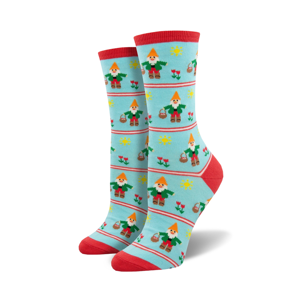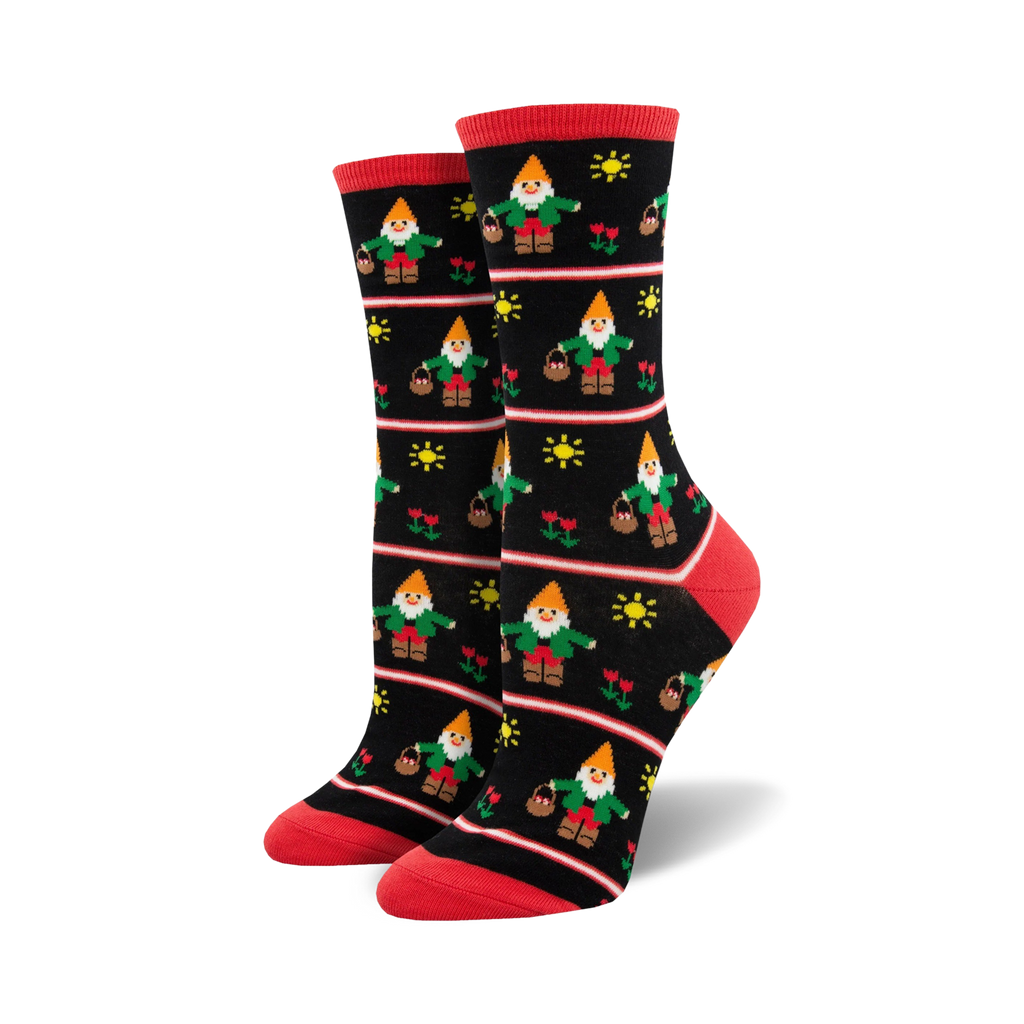 Garden gnome crew socks with red caps, green shirts, yellow baskets, red flowers, yellow suns, red tops with white stripes, and red bottoms. Quirky, comfy, and sure to bring a smile to your face.