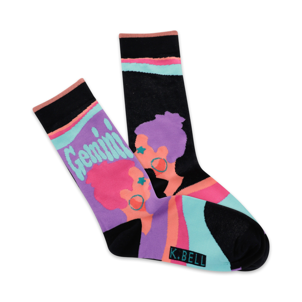 You are looking at a pair of women's crew socks with two funky cartoon-like women on them. Gemini represents the Zodiac twins. The two ladies are rocking purple hair, sunglasses, and a rainbow with stars. These vivid, multicolor patterns are sure to brighten up your dark socks drawer.