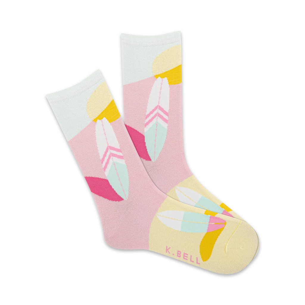 Aloha! Let's ride the wave of good vibes with our Geometric Surfboards socks. Picture this: pink and yellow waves, surfboards catching the perfect wave, and tropical feathers dancing in style. Get ready to hang ten and surf into a world of summery bliss every time you slide these socks onto your feet, dude!