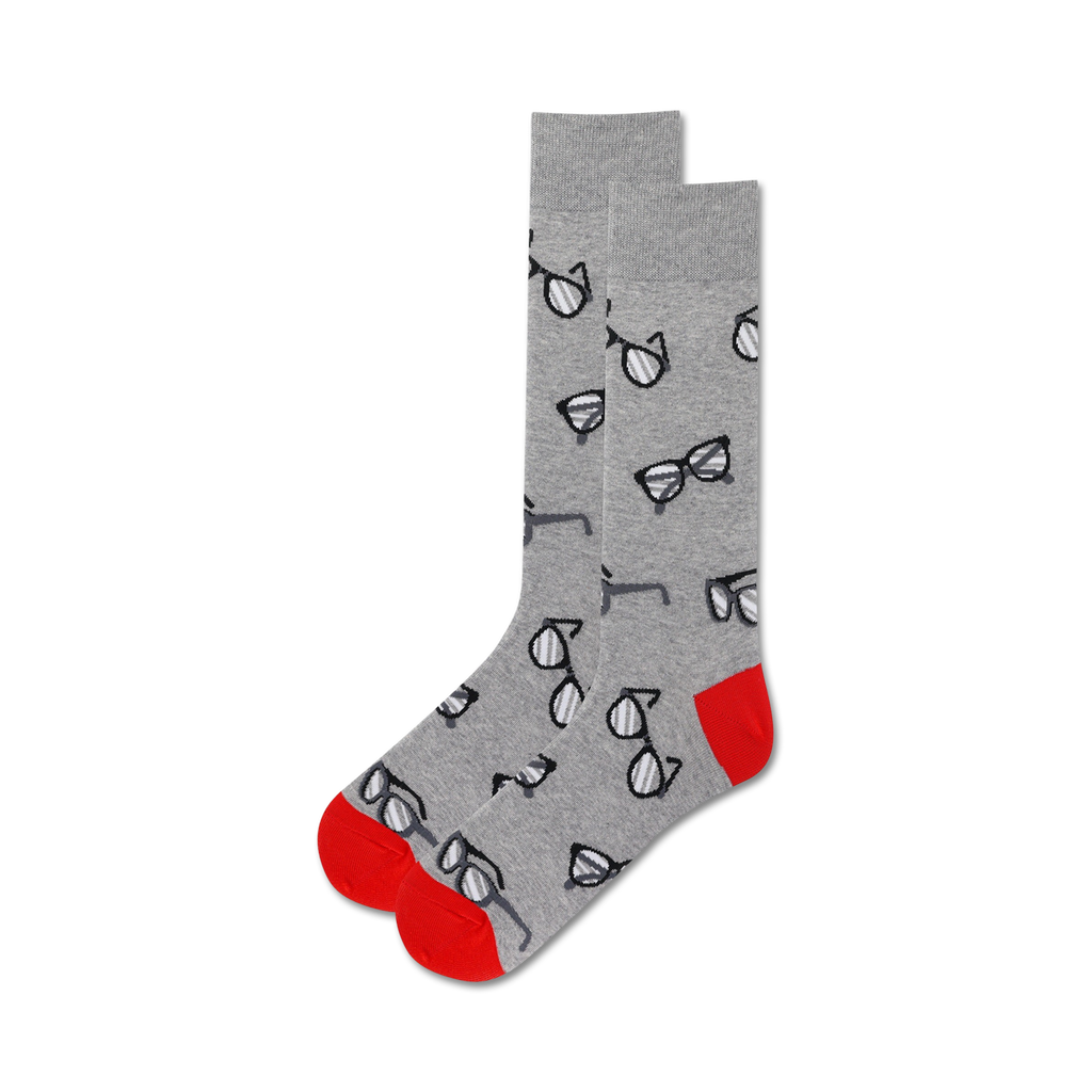 Say goodbye to boring socks and hello to Glasses! These specs-tacular socks are gray with a pattern of black and white striped eyeglasses. The toe and heel of the socks are red, adding a pop of color to your feet. Whether you're a bookworm, an optometrist, or just someone who loves a good pair of glasses, these socks are sure to make you smile. Show off your unique style and passion for glasses with these fun and stylish crew socks made just for men.