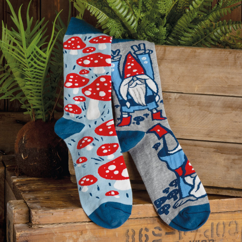 Calling all gnome enthusiasts and fashionable feet! Dive into a world of whimsy with our "Gnomes & Mushrooms" crew socks. These socks feature a delightful ensemble of red-hatted, blue-shirted gnomes frolicking amidst vibrant red and white mushrooms. With their cozy blue tops and grounding gray bottoms, these socks will keep you comfortable while you explore enchanted forests or conquer the daily grind. Wear them and become the life of the party (or, you know, just have fun and be yourself).